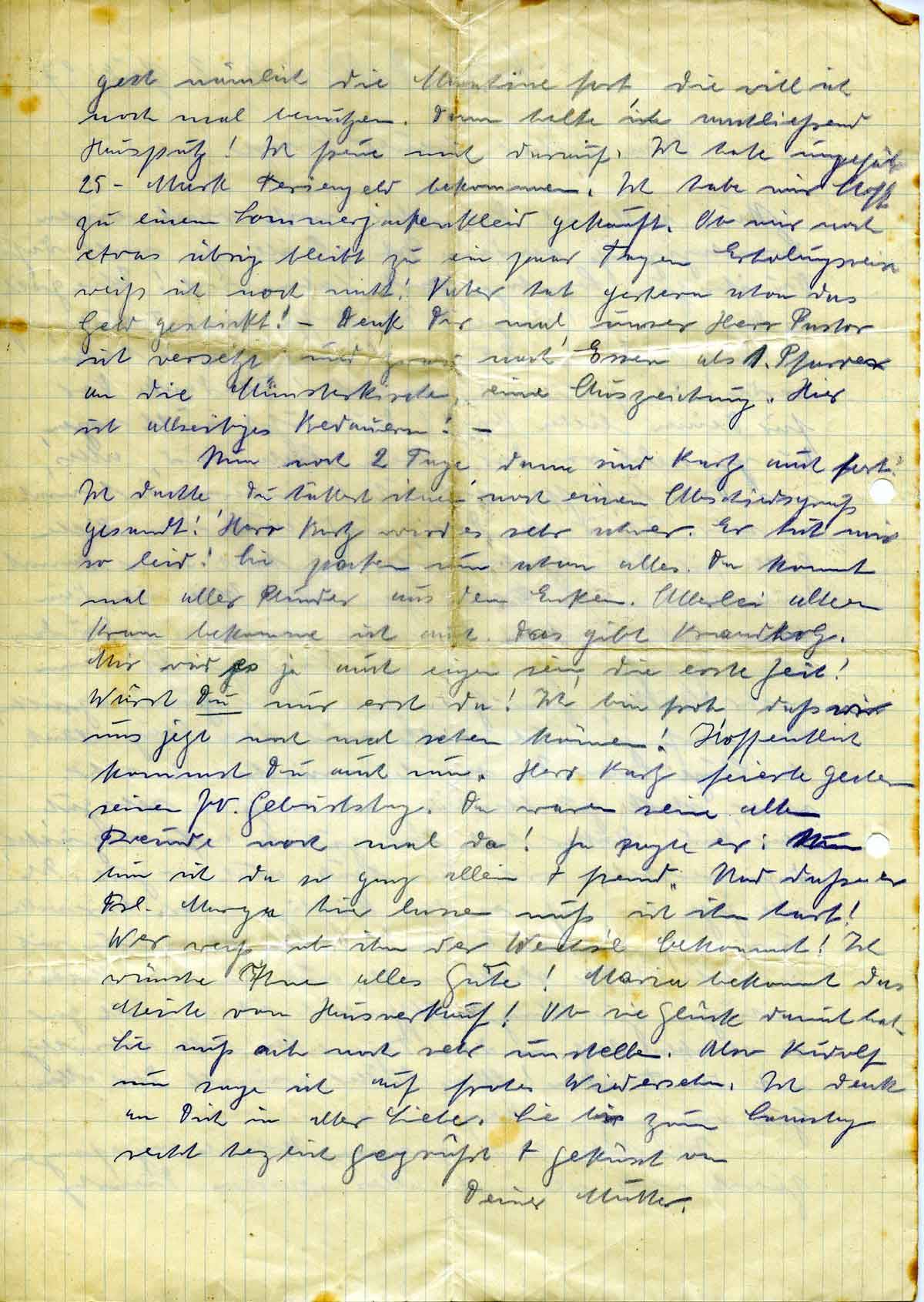 geht nämlich die Maschine fort, die will ich noch mal benutzen. Dann halte ich anschließend Hausputz! Ich freue mich darauf. Ich habe ungefähr 25.- Mark Feriengeld bekommen. Ich habe mir Stoff zu einem Sommerjackenkleid gekauft. Ob mir noch etwas übrig bleibt zu ein paar Tagen Erholungsreise weiß ich noch nicht! Vater hat gestern schon das Geld geschickt! – Denk Dir mal, unser Herr Pastor ist versetzt und zwar nach Essen als 1. Pfarrer an die Münsterkirche, eine Auszeichnung. Hier ist allseitiges Bedauern! –