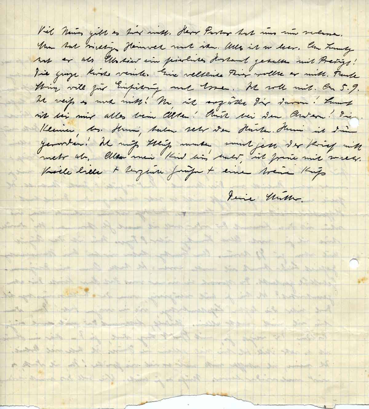 Du denkst sicher, Mutter hätte so viel Kirmes gefeiert, dass sie nicht Zeit hätte, Dir zu schreiben. Doch, das ist nicht so. Am Samstag musste ich noch abliefern und nachmittags für Oma + für Schlößers backen. Sonntag war es mir so schlecht, da habe ich nichts getan. In letzter Zeit klappt es mit meinem Herzen gar nicht. Ich will mal zu Dr. Körver. Ich denke, wenn Du erst mal wieder hier bist, geht es besser. Bete nur, mein Junge, dass der liebe Gott mich noch bei Dir läßt, bis Du allein fertig wirst. Wie Gott will! – Nun muß ich erst für Deine so lieben Briefe + für die Karte danken. Du bist ja so fleißig im Schreiben. Ich freue mich ja immer, wenn Nachricht von Dir kommt! Und so gute + frohe Nachricht. Ich freue mich auch, dass Du jetzt nicht so sehr anstrengenden Dienst hast! Hoffentlich bleibt das so im Manöver. Und dass wir uns nochmals sehen, wie schön ist das. Kommst Du, oder soll ich nach Gl. Kommen. Na, darüber höre ich ja noch. Also Sonntag über 8 Tage. Nun ist der August auch schon zu 2/3 herum. Am Sonntag haben wir bei Oma Namenstag gefeiert. Leider konnte ich nichts essen. Ich hatte Oma ein Diözesen-Gebetbuch geschenkt. Da sprach sie immer von. Hat Herr Kirste Dir schon geantwortet? Ich bin ja auch neugierig, wann der Entlassungstag ist. Doch sicher die letzten Septembertage, wie im vorigen Jahr! Dann, dann bin ich nicht mehr allein. Rudolf, bekommst Du auch noch einige Bilder, Du weißt ja, mit Pferd? Sorg doch, ja? – Hier im Hause ist es sehr still. Ich bin viel allein im Hause. Ich habe viel Arbeit. Ich meine, ich schaffte nicht mehr so viel wie früher! Na, ich denke, es wird mal wieder besser. Muß es ja auch. Wie soll das sonst werden?