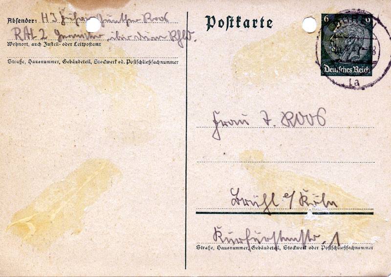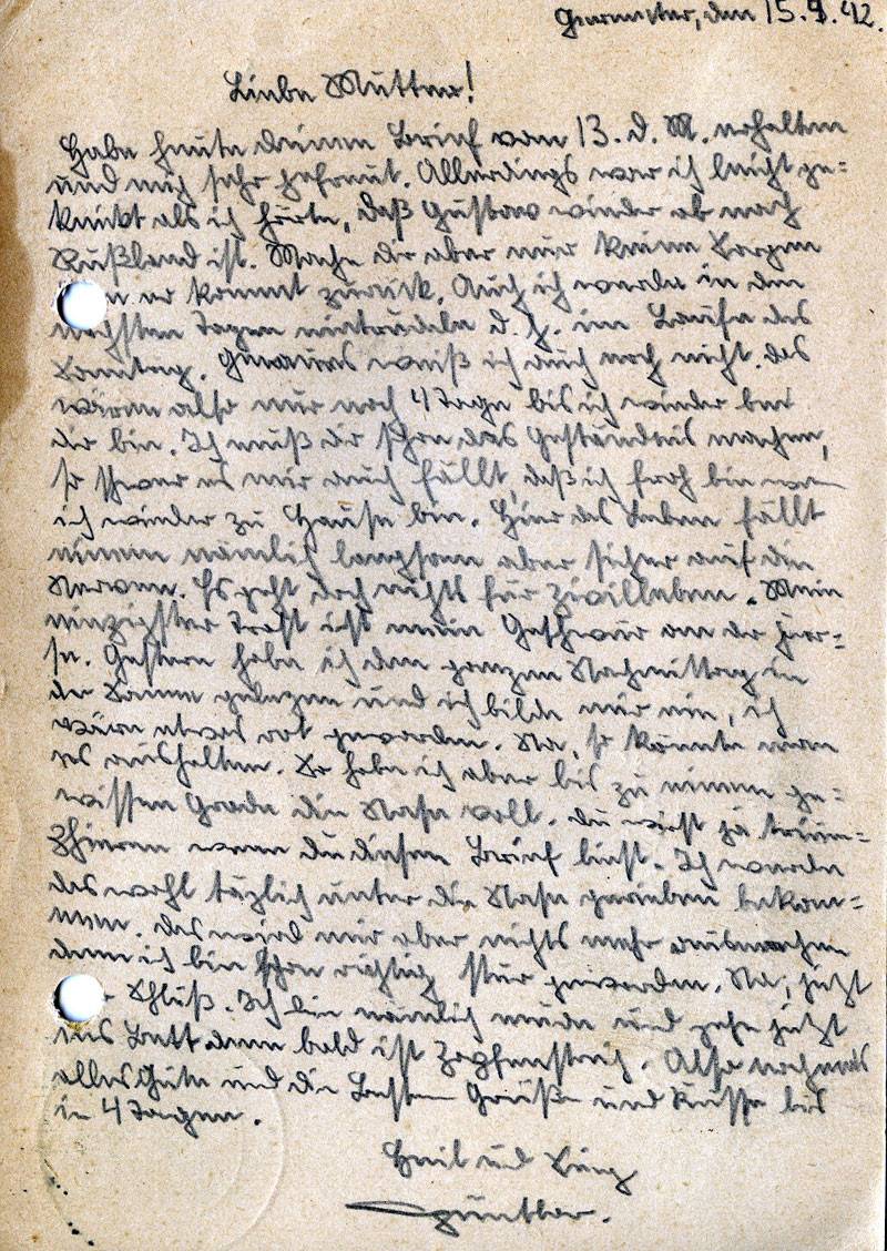 Habe heute Deinen Brief vom 13.d.m. erhalten und mich sehr gefreut. Allerdings war ich leicht geknickt, als ich hörte, dass Gustav wieder ab nach Russland ist. Mache Dir aber nur keine Sorgen, denn er kommt zurück. Auch ich werde in den nächsten Tagen eintrudeln, d.h. im Laufe des Sonntags. Genaues weiß ich auch noch nicht. Das wären also nur noch vier Tage, bis ich wieder bei Dir bin. Ich muss Dir schon das Geständnis machen, so schwer es mir auch fällt, dass ich froh bin; wenn ich wieder zu Hause bin. Hier das Leben fällt einem nämlich langsam aber sicher auf die Nerven. Es geht doch nichts für Zivilleben. Mein einziger Trost ist mein Geschwür an der Ferse. Gestern habe ich den ganzen Nachmittag in der Sonne gelegen, und ich bilde mir ein, ich wäre etwas rot geworden. Na, so könnte man es aushalten. So habe ich aber bis zu einem gewissen Grade die Nase voll. Du wirst ja triumphieren, wenn Du diesen Brief liest. Ich werde das wohl täglich unter die Nase gerieben bekommen. Das wird mir aber nichts mehr ausmachen, denn ich bin schon richtig stur geworden. Na, jetzt aber Schluss. Ich bin nämlich müde, und gehe jetzt ins Bett, denn bald ist Zapfenstreich. Also nochmals alles Gute und die besten Grüße und Küsse bis in 4 Tagen