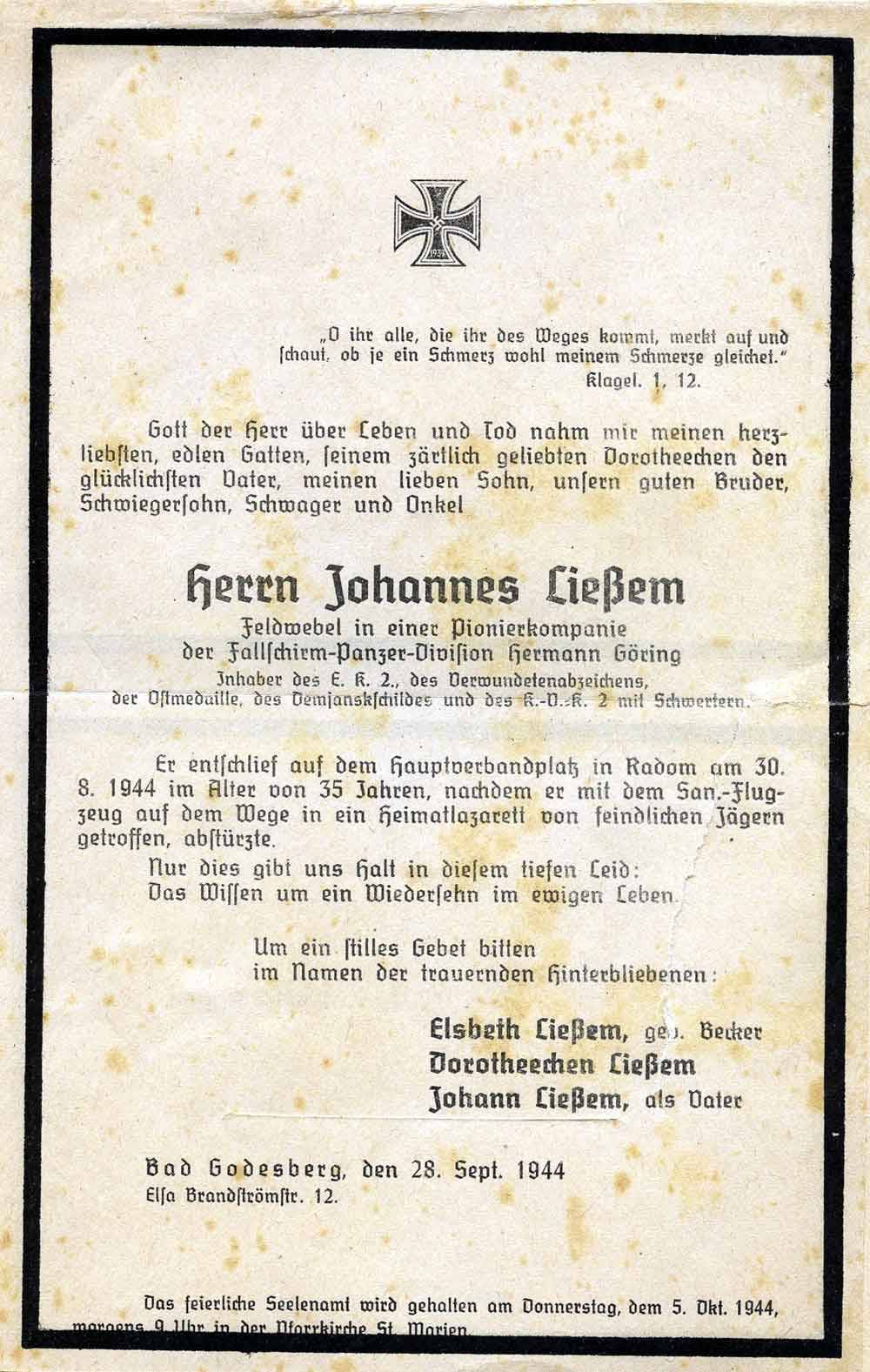 Im August 1944 wird mein Vater von der Ostfront nach Radom in Polen zum Hauptverbandsplatz gebracht, weil ein Blinddarmdurchbruch eine Notoperation erfordert. Nachdem er transportfähig ist, soll er am 29. August in ein Heimatlazarett geflogen werden. Das Flugzeug – mit dem Zeichen des Roten Kreuzes – wird nach dem Start in einer Höhe von achtzig Metern von russischen Jägern abgeschossen. Er überlebt den Absturz noch zwei Tage mit schweren Verbrennungen. - Mein Vater stirbt am 30. August 1944 an den Folgen des Abschusses.“