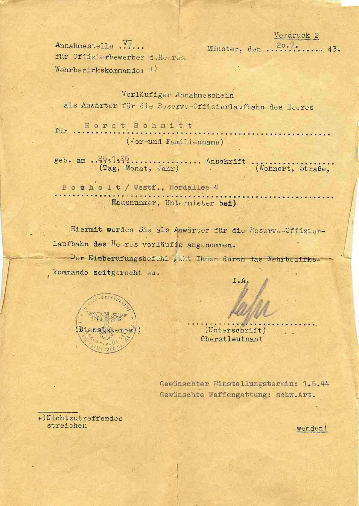 Die Grundausbildung in Osnabrück dauerte bis zum Ende des Krieges. Als die Offiziersanwärter sich schließlich auf den Weg nach Westen machten, gerieten sie bei Bielefeld in englische Gefangenschaft. Erst im März 1946 wurde Horst Schmitt entlassen und kehrte nach Bocholt zurück. 1947 nahm er ein Jurastudium auf.