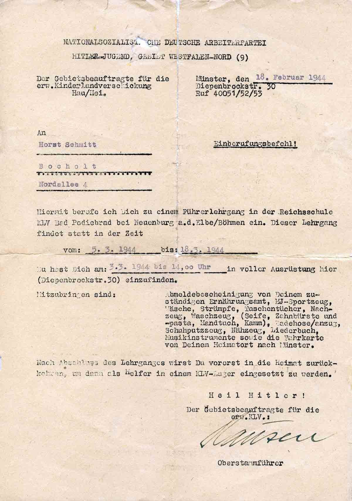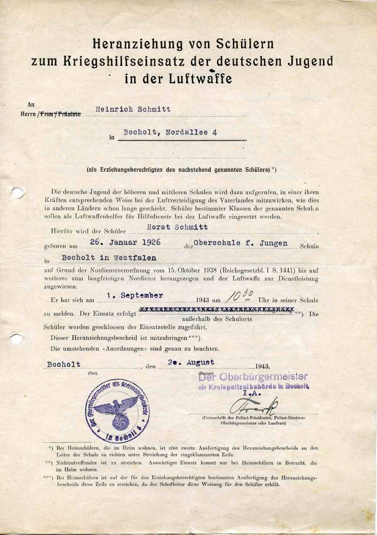 Nach vierjähriger Volksschulzeit wechselte Horst Schmitt auf das Bocholter Gymnasium. Nachdem er bereits 1941 mit 14 Jahren zum Fähnleinführer befördert worden war, wurde er seit 1942 wiederholt als HJ-Führer in der KLV eingesetzt und war zuletzt als Hauptlagermannschaftsführer für rund 2.500 Kinder verantwortlich. 1943 folge ein Einsatz als Luftwaffenhelfer, bevor Horst Schmitt dann Mitte 1944 nach Ablegung des Abiturs noch zur Wehrmacht einberufen wurde.
