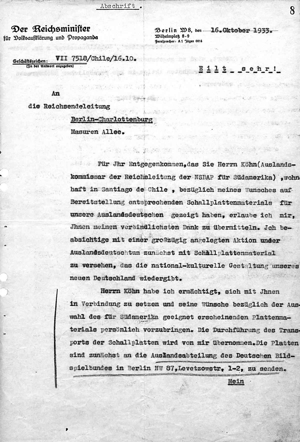 Die hier im Mittelpunkt des Interesses stehende „Zentralstelle für Deutsche Kulturfunksendungen im Ausland“ erlebte ihre „Geburtsstunde“ offenbar im Herbst 1933 in eben jenem Reichspropagandaministerium. Hier erschien am 13. Oktober der Landesgruppenleiter der NSDAP-Auslandsorganisation (NSDAP-AO) in Chile, Willi Köhn[1], und trug dem Sachbearbeiter der Abteilung VII[2], Legions-Rat Dr. Unverfehrt, folgende Bitte vor: „Mit Rücksicht darauf, dass der chilenische Rundfunk für deutsche Übertragungen seit kurzer Zeit zur Verfügung stände, sei die Beschaffung geeigneten Schallplattenmaterials dringend erforderlich.“ Unverfehrt sagte dem NSDAP-Landesgruppenleiter daraufhin zu, dass ihm das gewünschte Material durch die „Auslands-Abteilung des Deutschen Lichtspiel-Dienstes“ bis zur Höhe von 300 RM nach Santiago de Chile zugeschickt würde. Im Propagandaministerium fand man die Idee Köhns offenbar derart reizvoll, dass zugleich auch ein direkter Kontakt zur Reichs-Rundfunk-Gesellschaft (RRG) hergestellt wurde, „um Herrn Köhn die Möglichkeit zu geben, die Bestände des dortigen Schallplattenarchivs zu prüfen“.[3] Nachdem die Reichssendeleitung umgehend ihre Zustimmung zu einem solchen Vorhaben gegeben hatte, übermittelte ihr der Sachbearbeiter des Propagandaministeriums am 16. Oktober nicht nur seinen Dank, sondern auch seine Absicht, „mit einer großzügig angelegten Aktion unser Auslandsdeutschtum zunächst mit Schallplattenmaterial zu versehen, das die national-kulturelle Gestaltung unseres neuen Deutschland wiedergibt“. Die Übermittlungsfunktion für die Tonträger sollte nach wie vor die „Auslands-Abteilung des Deutschen Lichtspiel-Dienstes“ übernehmen.[4]
