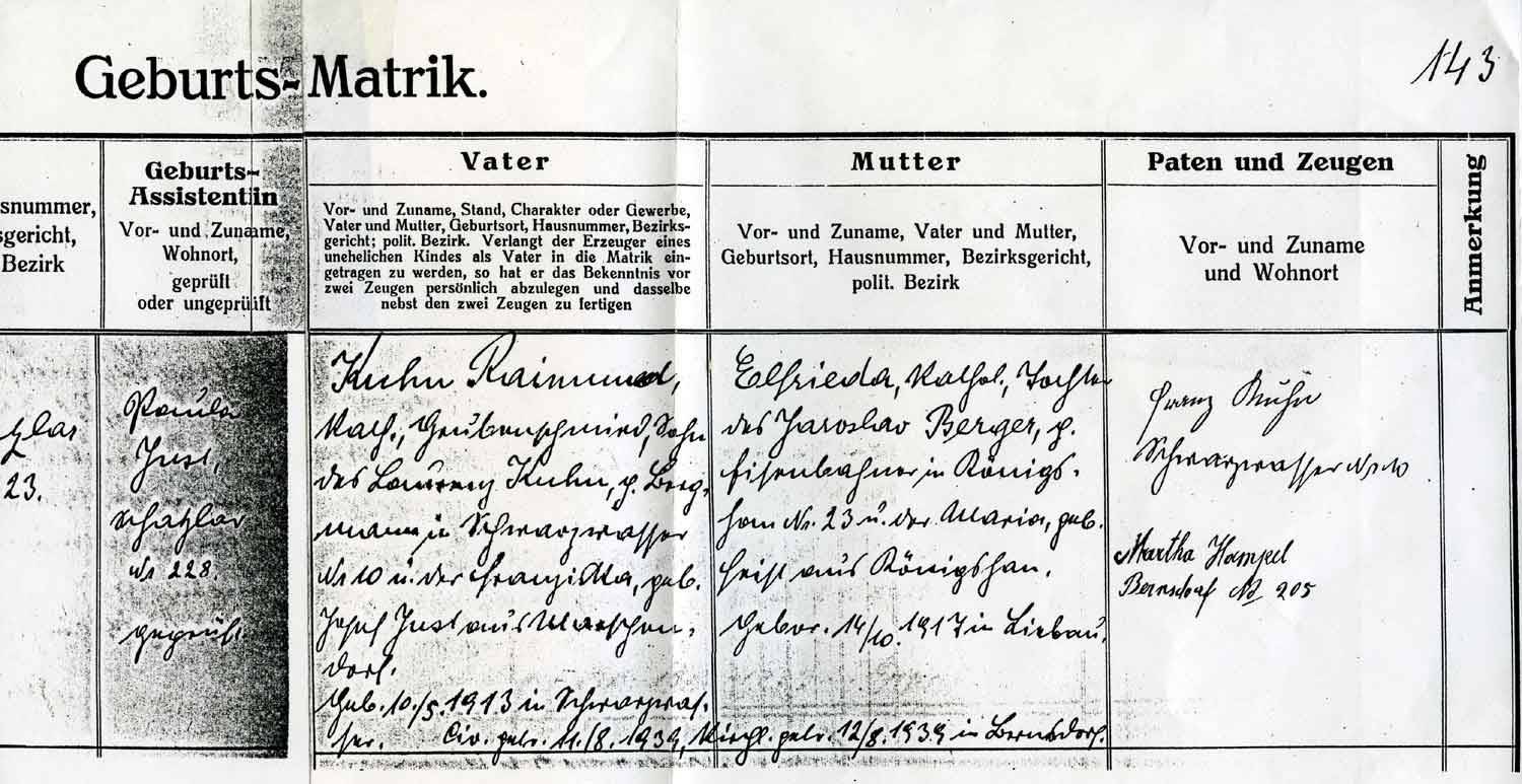 Angeregt durch den Hinweis einer ebenfalls aus dem Sudetenland stammende Jüchenerin – der Schwester des hier ebenfalls porträtierten Werner Schuh – sieht Wolfgang Kuhn Kirchenbücher und Personenstandsunterlagen ein. Im Bürgermeisteramt wird ihm schließlich tatsächlich seine Geburtsurkunde vorgelegt: „Da stand ich da“, stellt er noch heute positiv überrascht fest, „da las ich meinen Namen in Schatzlar!“
