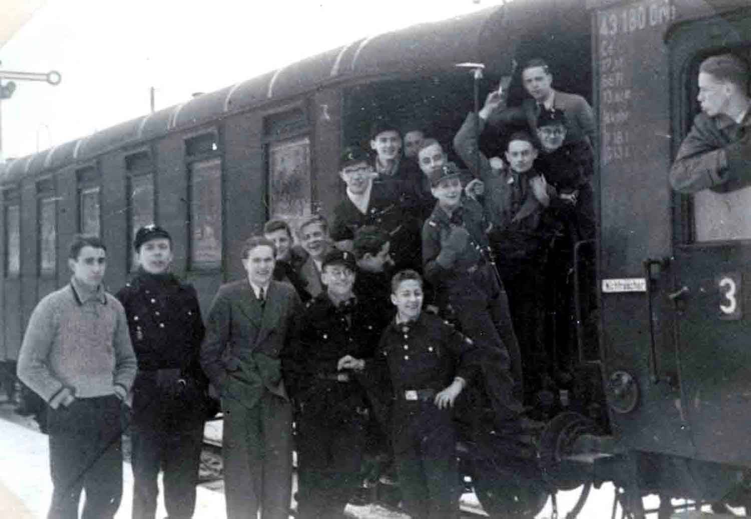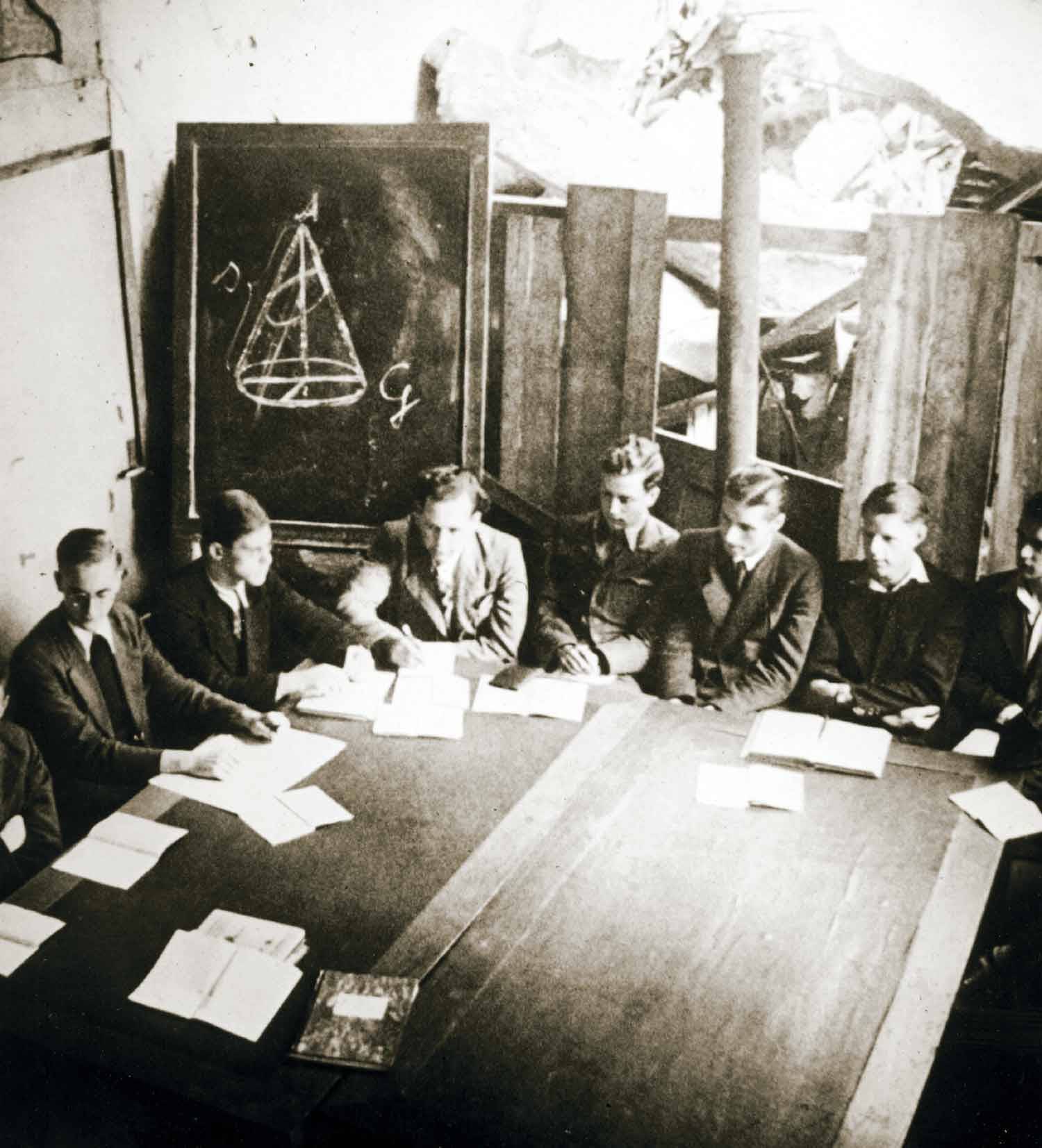 Einschnitte ganz anderer Art bestimmten den schulischen Alltag in den Jahren des Zweiten Weltkriegs.[7] Die unmittelbar nach Kriegsbeginn am deutlichsten spürbare Einschränkung des Schulbetriebs resultierte aus den massenhaften Einberufungen von Lehrkräften. Eine erste Auflistung beinhaltet für den 28. September 1939 elf zur Wehrmacht eingezogene Lehrkräfte, wobei zu diesem Zeitpunkt jeder Hinweis darauf fehlt, dass sie durch aus dem Ruhestand zurückgeholte Kollegen ersetzt worden wären. Im Januar 1941 waren dann 20, im Mai des Jahres bereits 25 und im September schließlich 27 DKG-Lehrer „zu den Waffen gerufen“ worden. Damit war genau die Hälfte des zu diesem Zeitpunkt 54 Lehrkräfte zählenden DKG-Kollegiums eingezogen worden. Zahlen für spätere Jahre fehlen. Einher damit ging auch eine Verkleinerung der Schülerzahl, die sich bei Kriegsbeginn auf 565 belaufen hatte, um dann bis Mai 1941 auf 474 zurückzugehen.