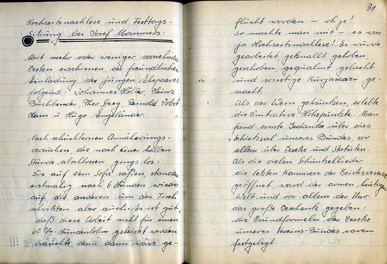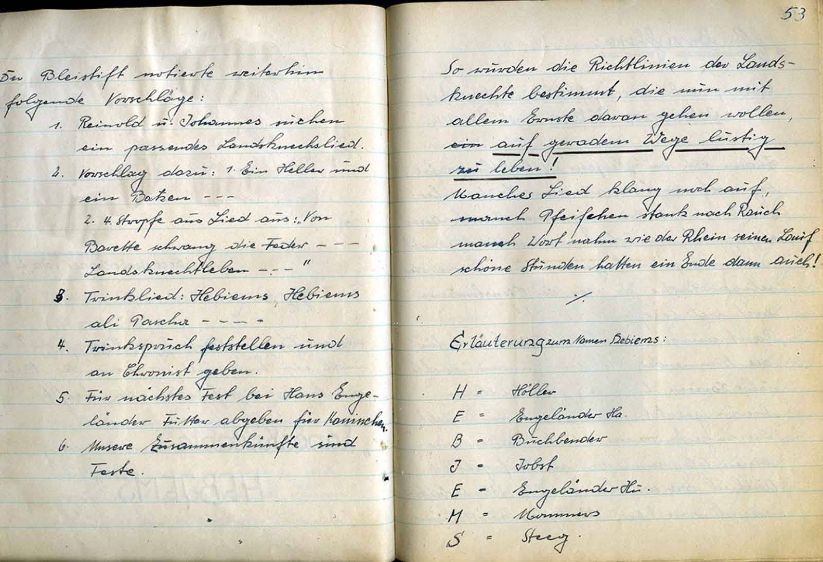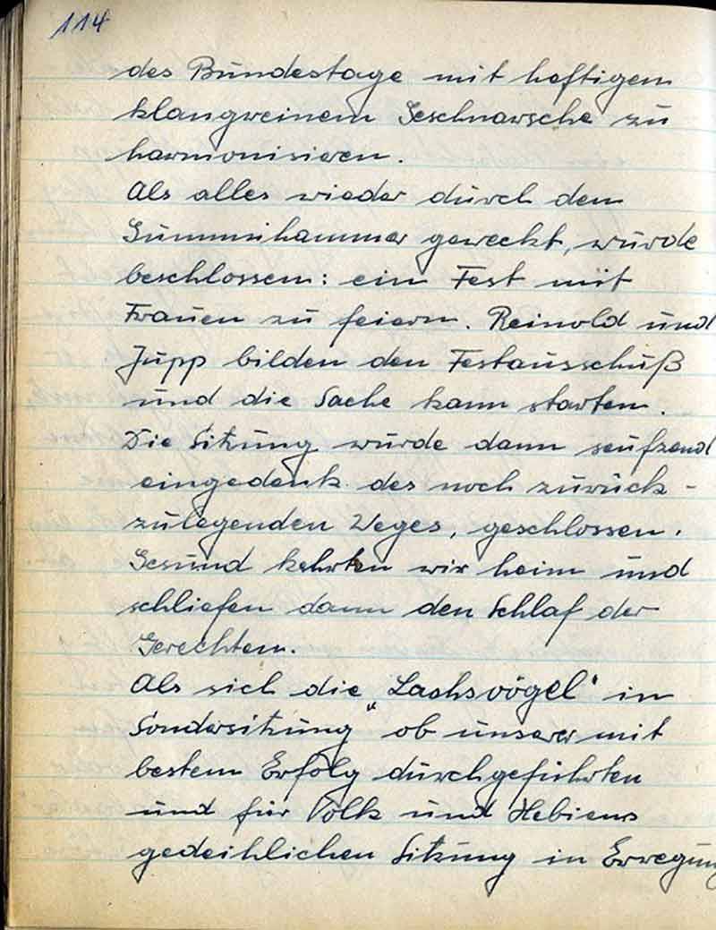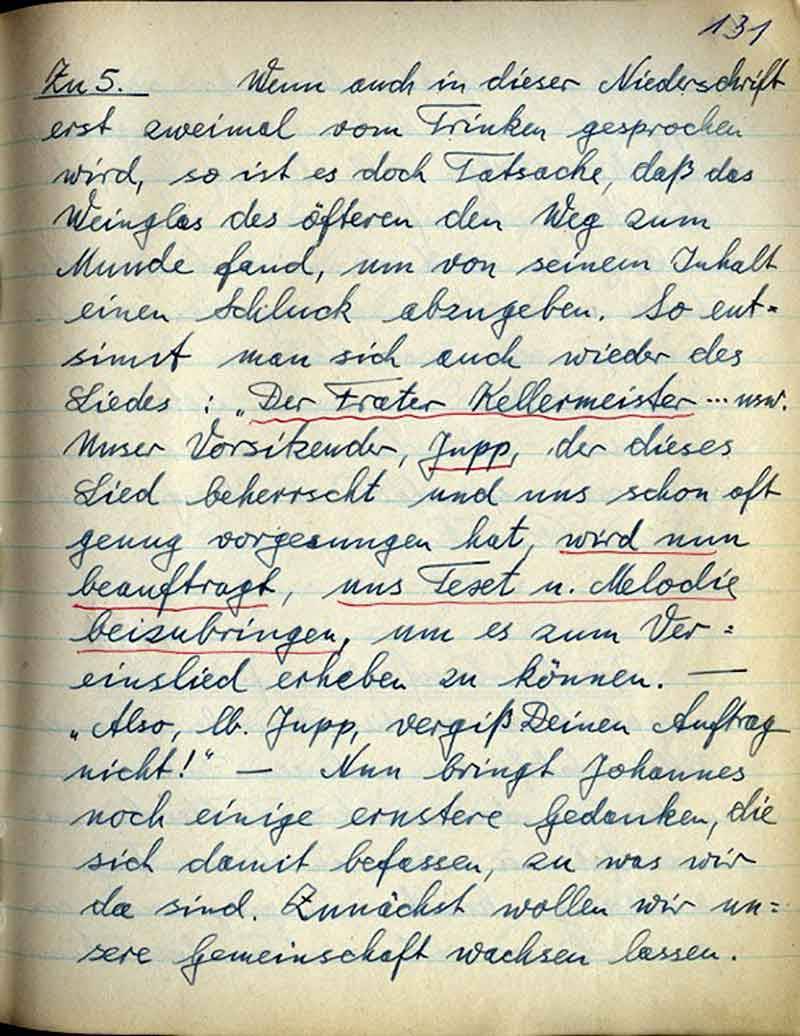 Zu 5: Wenn auch in dieser Niederschrift erst einmal vom Trinken gesprochen wird, so ist es doch Tatsache, daß das Weinglas des öfteren den Weg zum Munde fand, um von seinem Inhalt einen Schluck abzugeben. So entsinnt man sich auch wieder des Liedes: „Der Frater Kellermeister“ … usw. Unser Vorsitzender, Jupp, der dieses Lied beherrscht und uns schon oft genug vorgesungen hat, wird nun beauftragt, uns Text u. Melodie beizubringen, um es zum Vereinlied erheben zu können. - „Also, lb. Jupp, vergiß Deinen Auftrag nicht12 – Nun bringt Johannes noch einige ernstere Gedanken, die sich damit befassen, zu was wir da sind. Zunächst wollen wir unsere Gemeinschaft wachsen lassen.