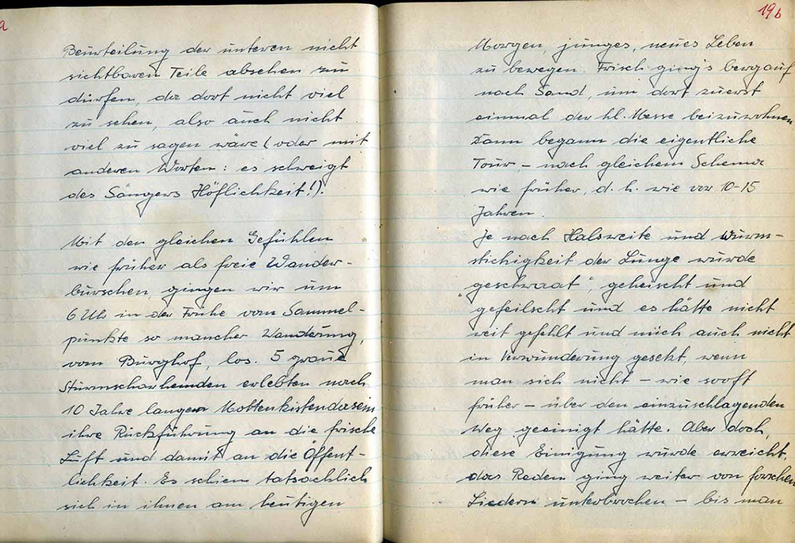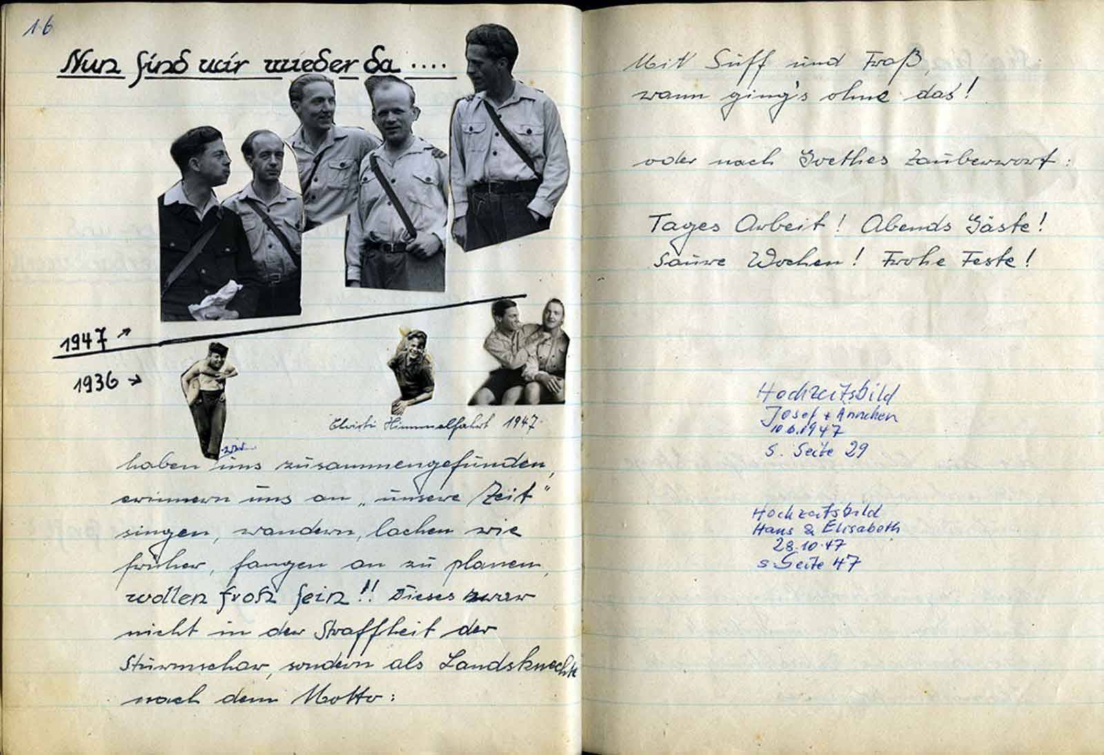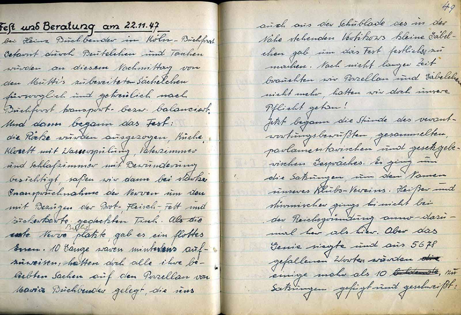 Zu 5: Wenn auch in dieser Niederschrift erst einmal vom Trinken gesprochen wird, so ist es doch Tatsache, daß das Weinglas des öfteren den Weg zum Munde fand, um von seinem Inhalt einen Schluck abzugeben. So entsinnt man sich auch wieder des Liedes: „Der Frater Kellermeister“ … usw. Unser Vorsitzender, Jupp, der dieses Lied beherrscht und uns schon oft genug vorgesungen hat, wird nun beauftragt, uns Text u. Melodie beizubringen, um es zum Vereinlied erheben zu können. - „Also, lb. Jupp, vergiß Deinen Auftrag nicht12 – Nun bringt Johannes noch einige ernstere Gedanken, die sich damit befassen, zu was wir da sind. Zunächst wollen wir unsere Gemeinschaft wachsen lassen.