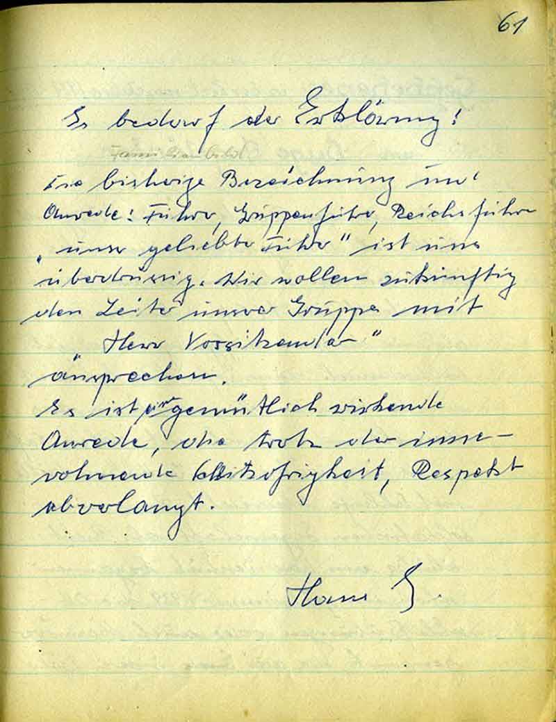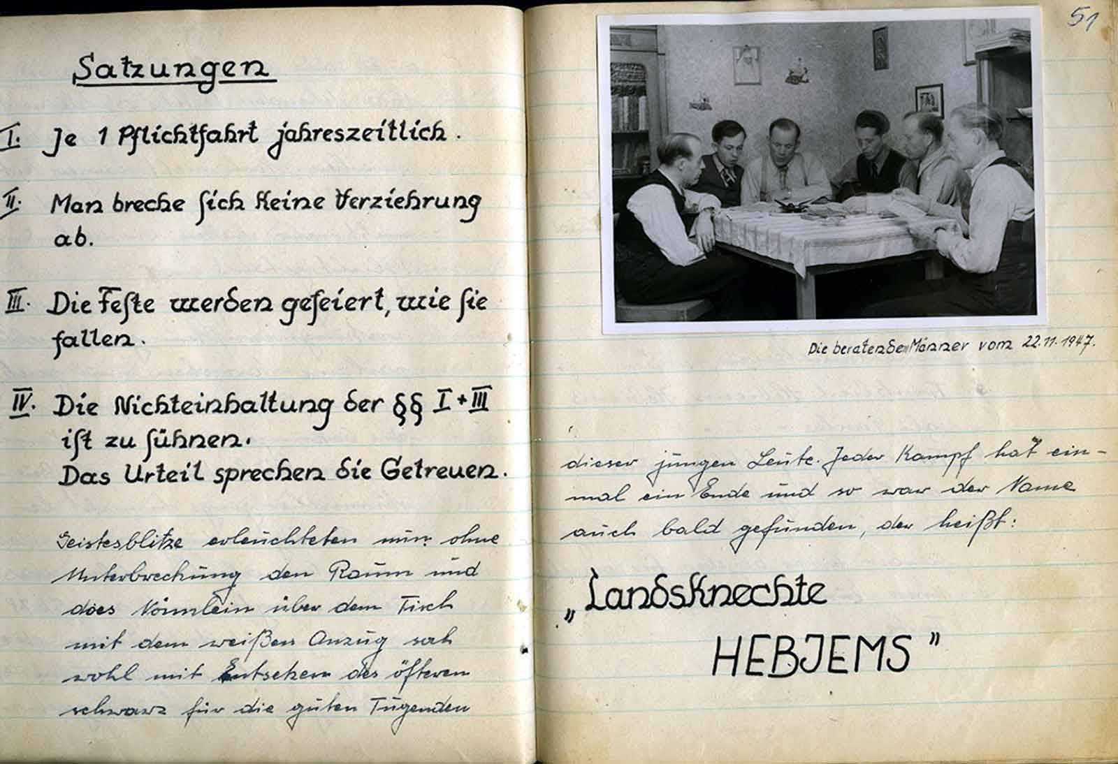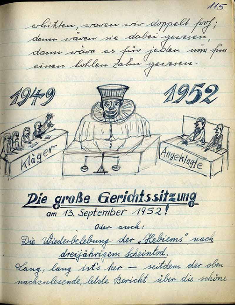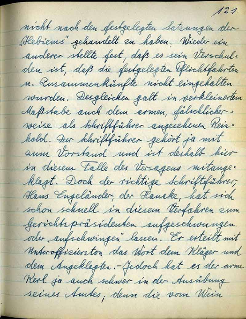 nicht nach den festgelegten Satzungen der „Hebiems“ gehandelt zu haben. Wieder ein anderer stellte fest, daß sein Verschulden ist, daß die festgelegten Pflichtfahrten u. Zusammenkünfte nicht eingehalten wurden. Desgleichen galt in verkleinertem Maßstabe auch dem armen, fälschlicherweise als Schriftführer angesehenen Reinhold. Der Schriftführer gehört ja mit zum Vorstand und ist deshalb hier in diesem Falle des Versagens mitangeklagt. Doch der richtige Schriftführer, Hans Engeländer, der Hanake, hat sich schon schnell in diesem Verfahren zum Gerichtspräsidenten aufgeschwungen oder „aufschwingen“ lassen. Er erteilt mit Unteroffizierston das Wort dem Kläger und dem Angeklagten. – Jedoch hat es der arme Kerl ja auch schwer in der Ausübung seines Amtes; denn die vom Wein