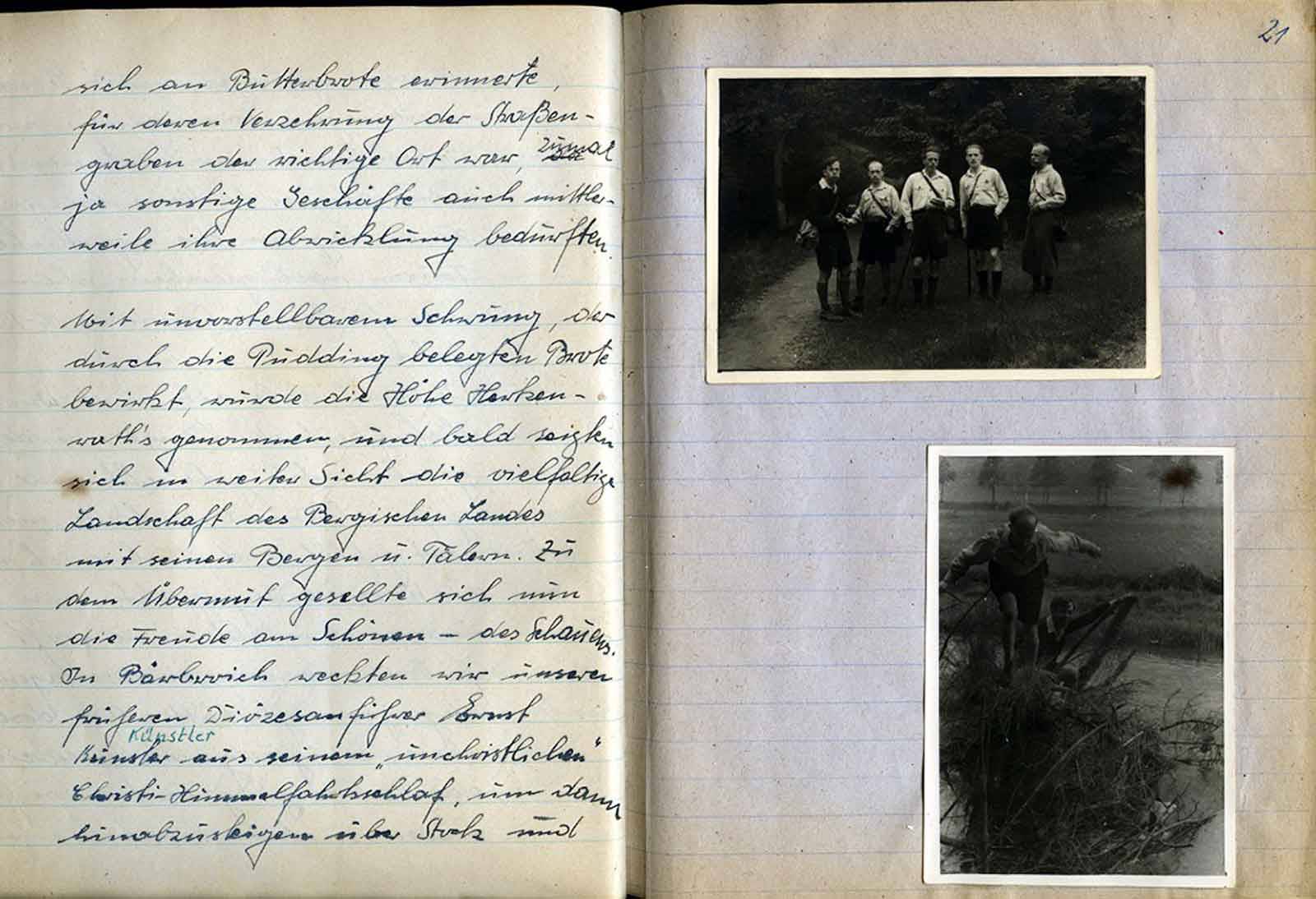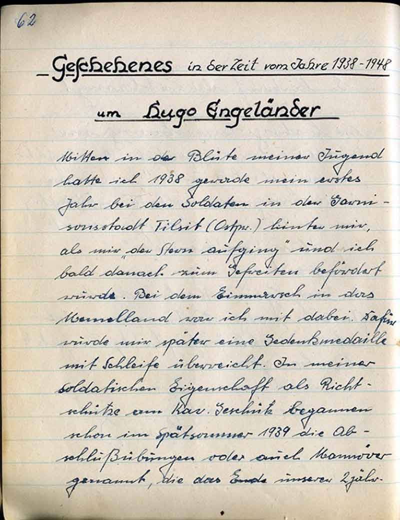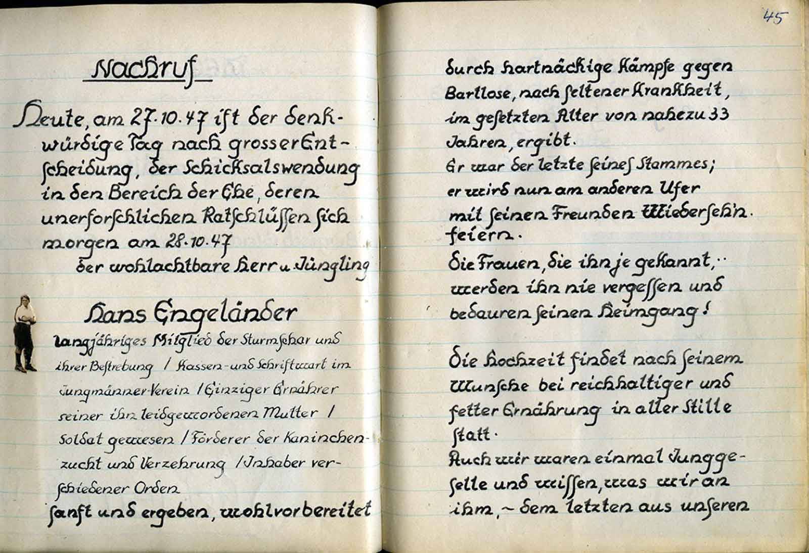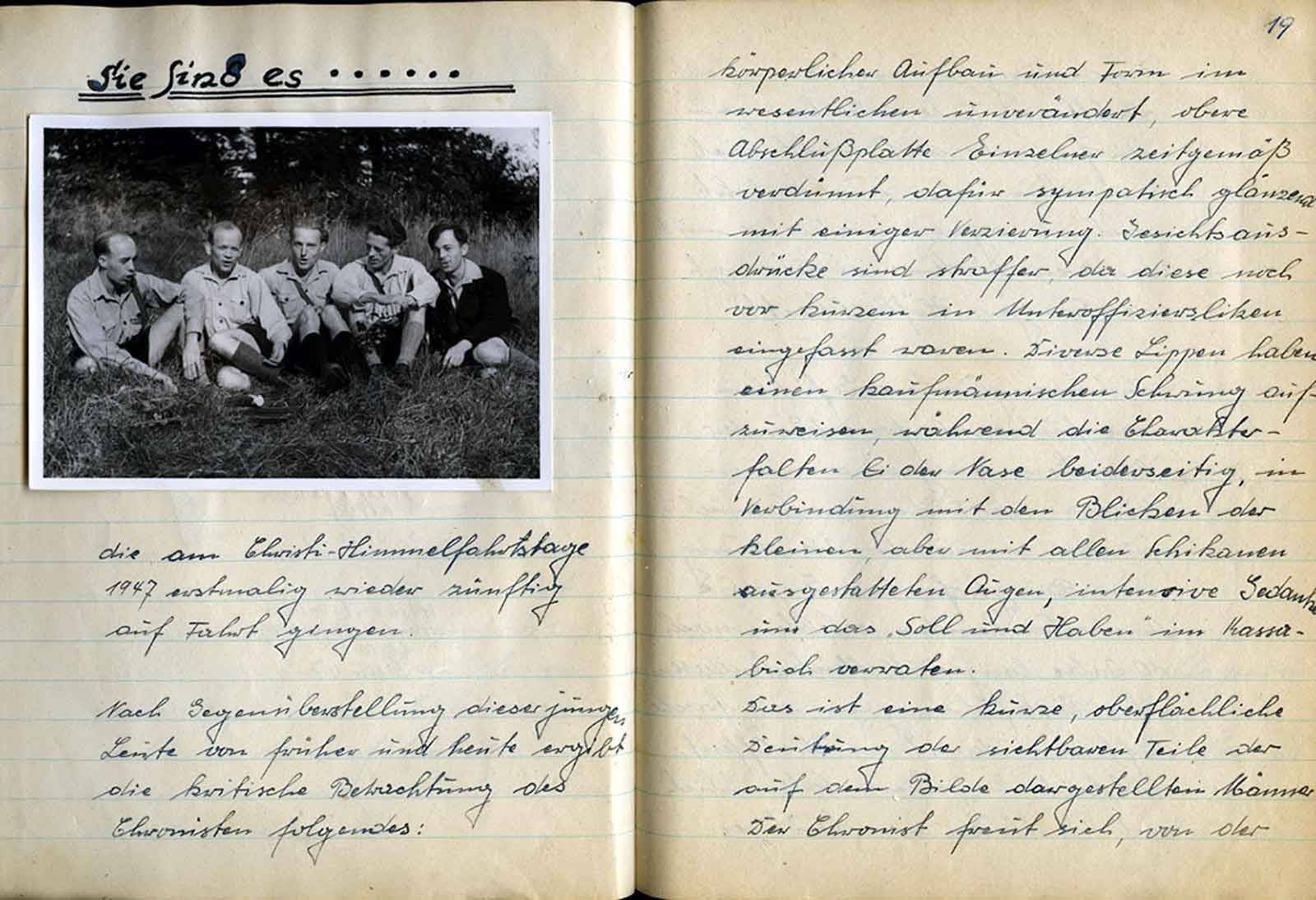nicht nach den festgelegten Satzungen der „Hebiems“ gehandelt zu haben. Wieder ein anderer stellte fest, daß sein Verschulden ist, daß die festgelegten Pflichtfahrten u. Zusammenkünfte nicht eingehalten wurden. Desgleichen galt in verkleinertem Maßstabe auch dem armen, fälschlicherweise als Schriftführer angesehenen Reinhold. Der Schriftführer gehört ja mit zum Vorstand und ist deshalb hier in diesem Falle des Versagens mitangeklagt. Doch der richtige Schriftführer, Hans Engeländer, der Hanake, hat sich schon schnell in diesem Verfahren zum Gerichtspräsidenten aufgeschwungen oder „aufschwingen“ lassen. Er erteilt mit Unteroffizierston das Wort dem Kläger und dem Angeklagten. – Jedoch hat es der arme Kerl ja auch schwer in der Ausübung seines Amtes; denn die vom Wein