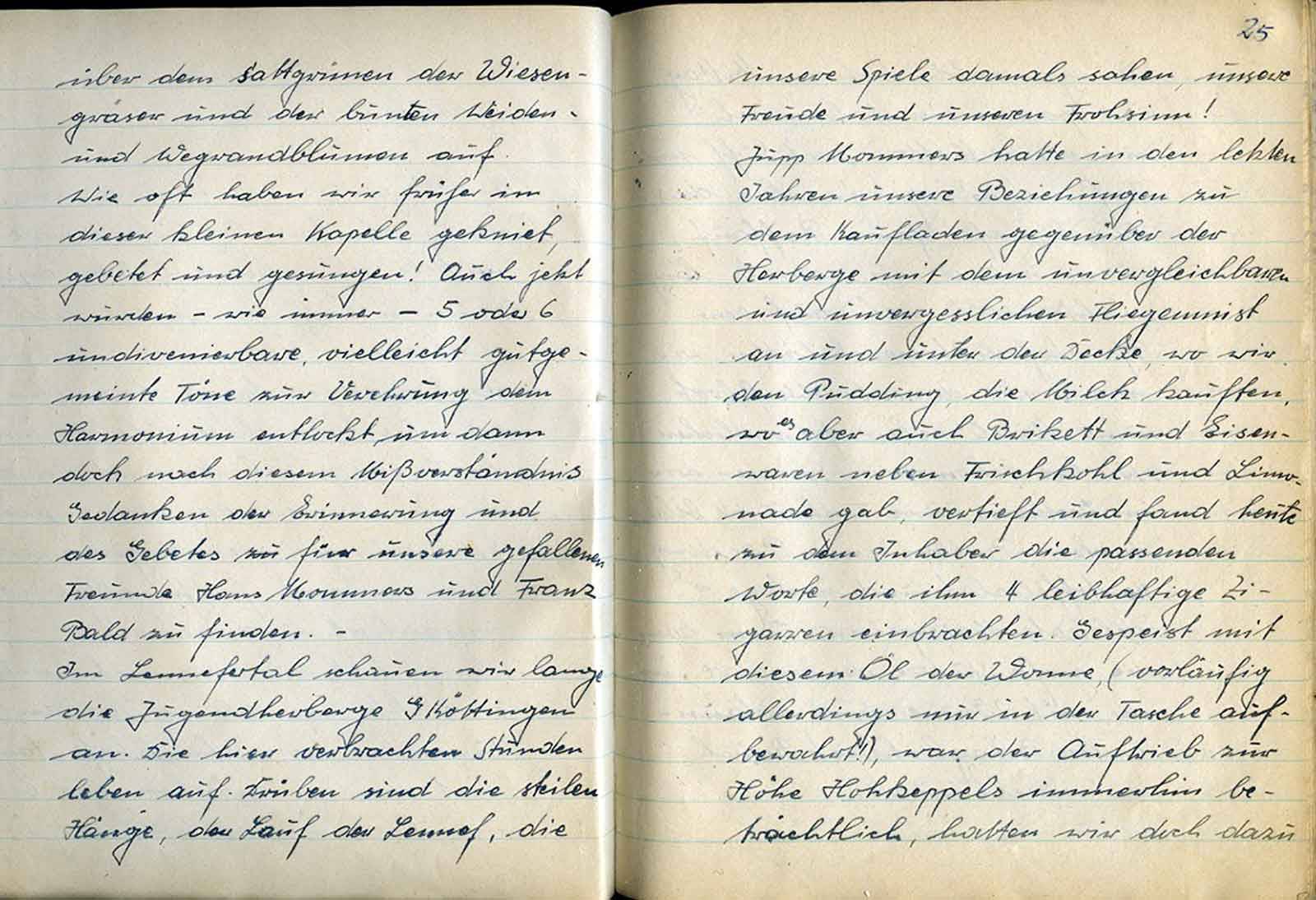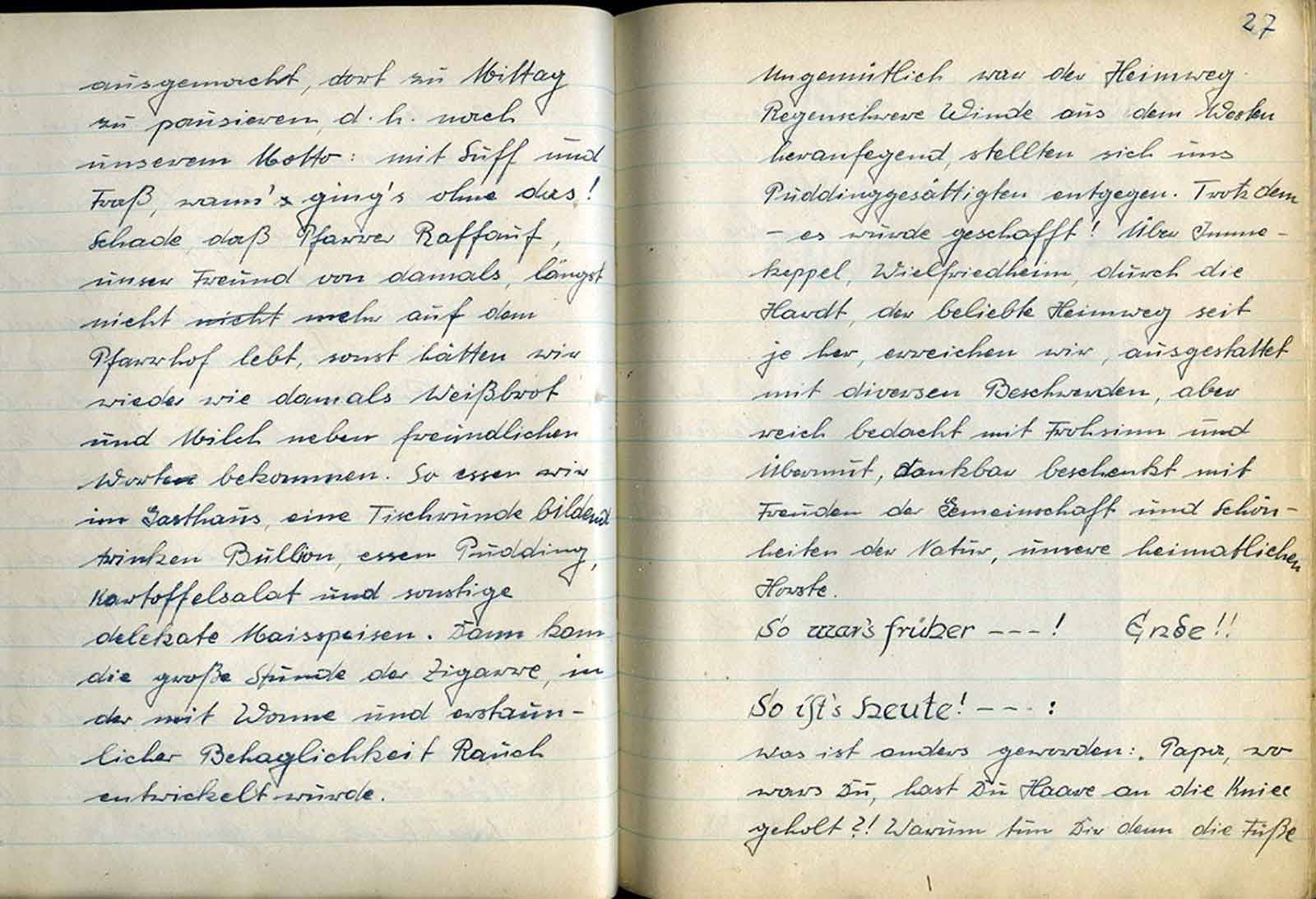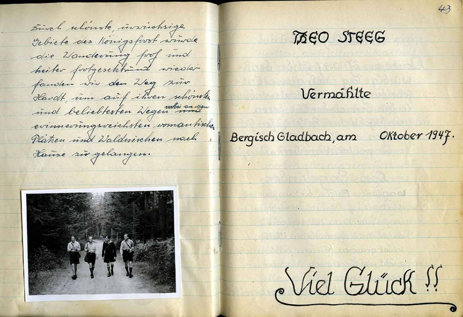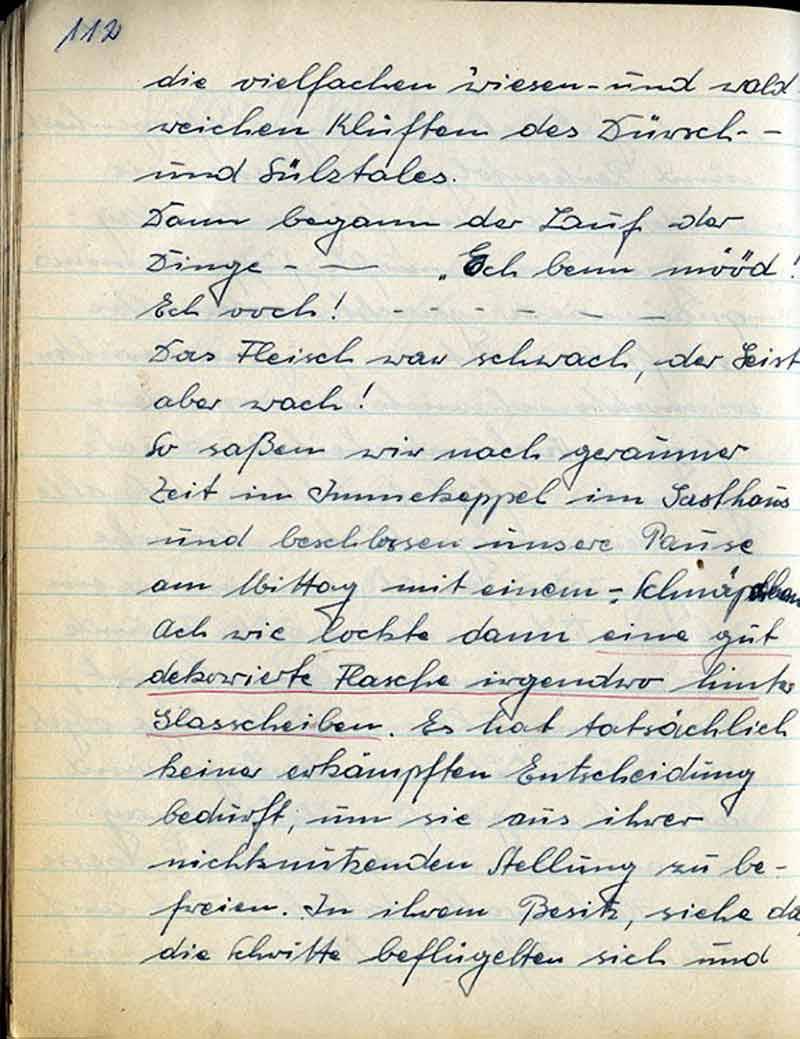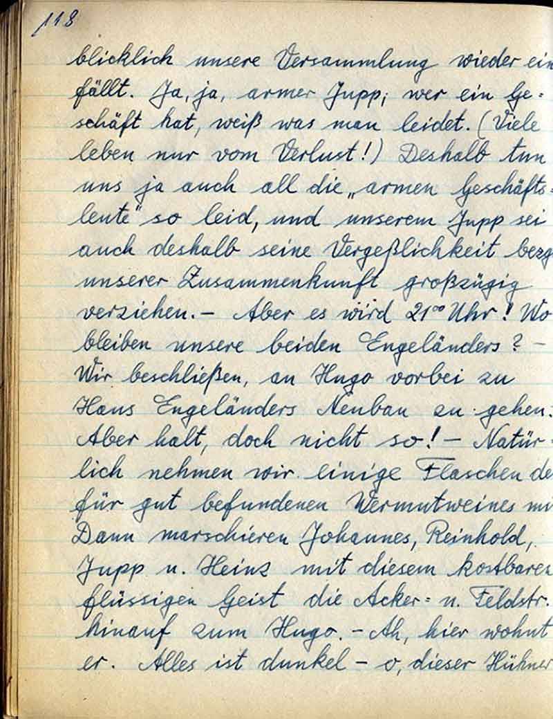 blicklich unsere Versammlung wieder einfällt. Ja, ja, armer Jupp; wer ein Geschäft hat, weiß was man leidet. (Viele leben nur vom Verlust!) Deshalb tun uns ja auch all die „armen Geschäftsleute“ so leide, und unserem Jupp sei auch deshalb seine Vergesslichkeit bezg. Unserer Zusammenkunft großzügig verziehen. – Aber es wird 2100 Uhr! Wo bleiben unsere beiden Engeländers? – Wir beschließen, an Hugo vorbei zu Hans Engeländers Neubau zu gehen. Aber halt, doch nicht so! – Natürlich nehmen wir einige Flaschen des für gut befundenen Wermutweines mit. Dann marschieren Johannes, Reinhold, Jupp u. Heinz mit diesem kostbaren flüssigen Geist die Acker- u. Feldstr. Hinauf zum Hugo. – Ah, hier wohl er. Alles ist dunkel - o dieser Hühner
