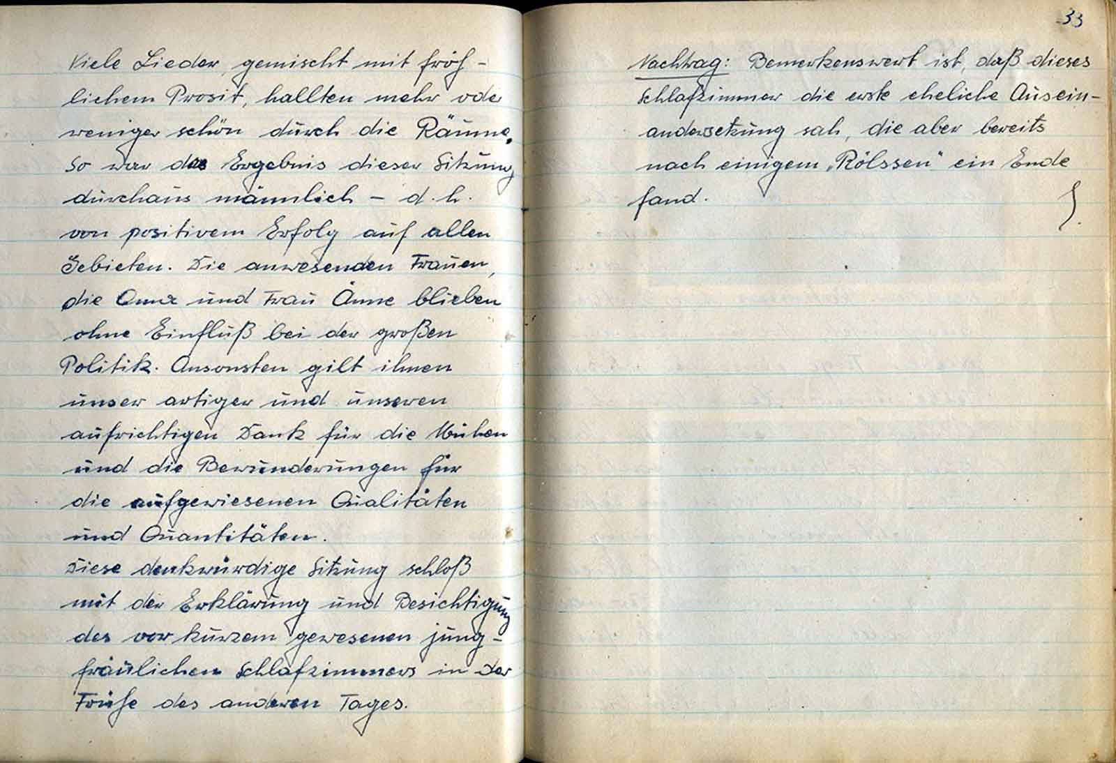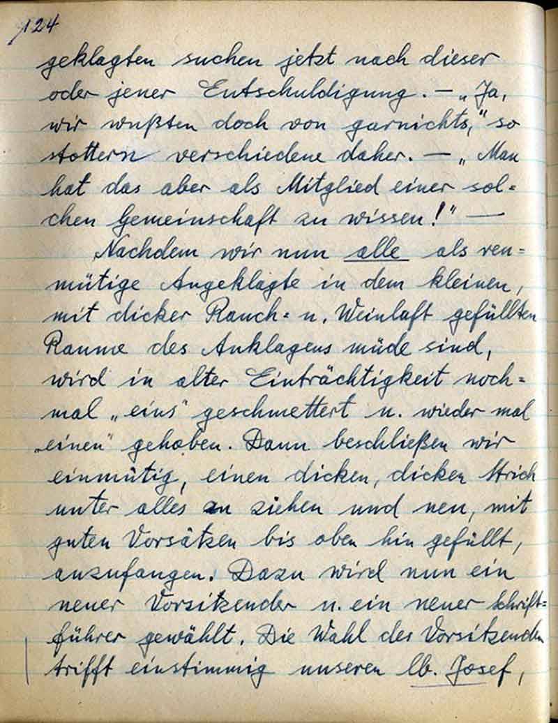 Nachdem wir nun alle als reumütige Angeklagte in dem kleinen, mit dicker Rauch- u. Weinluft gefüllten Raume des Anklagens müde sind, wird in alter Einträchtigkeit nochmals „eins“ geschmettert u. wieder mal „einen“ gehoben. Dann beschließen wir einmütig, einen dicken, dicken Strich unter alles zu ziehen und neu, mit guten Vorsätzen bis oben hin gefüllt, anzufangen. Dazu wird nun ein neuer Vorsitzender u. ein neuer Schriftführer gewählt. Die Wahl des Vorsitzenden trifft einstimmig unseren lb. Josef,