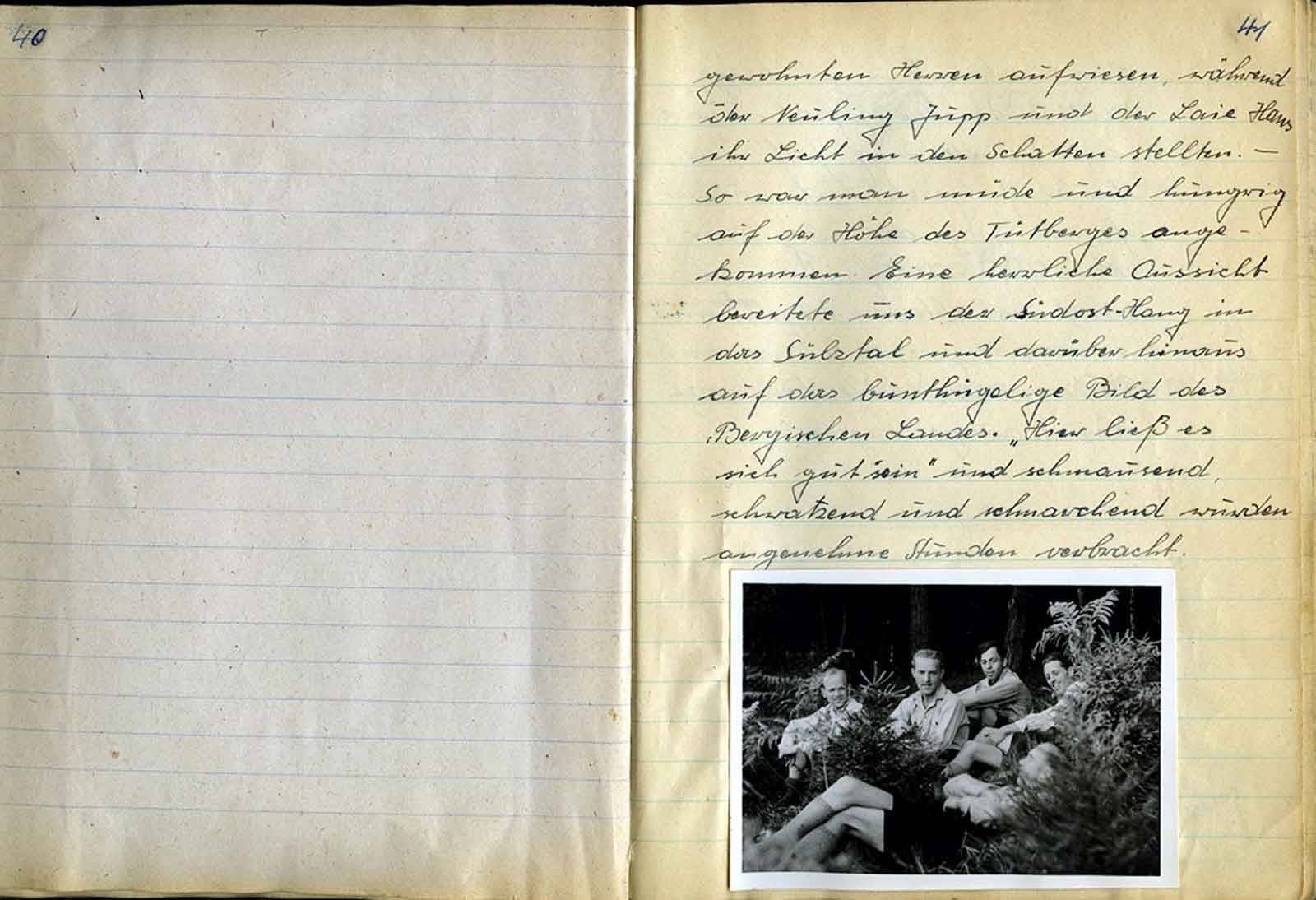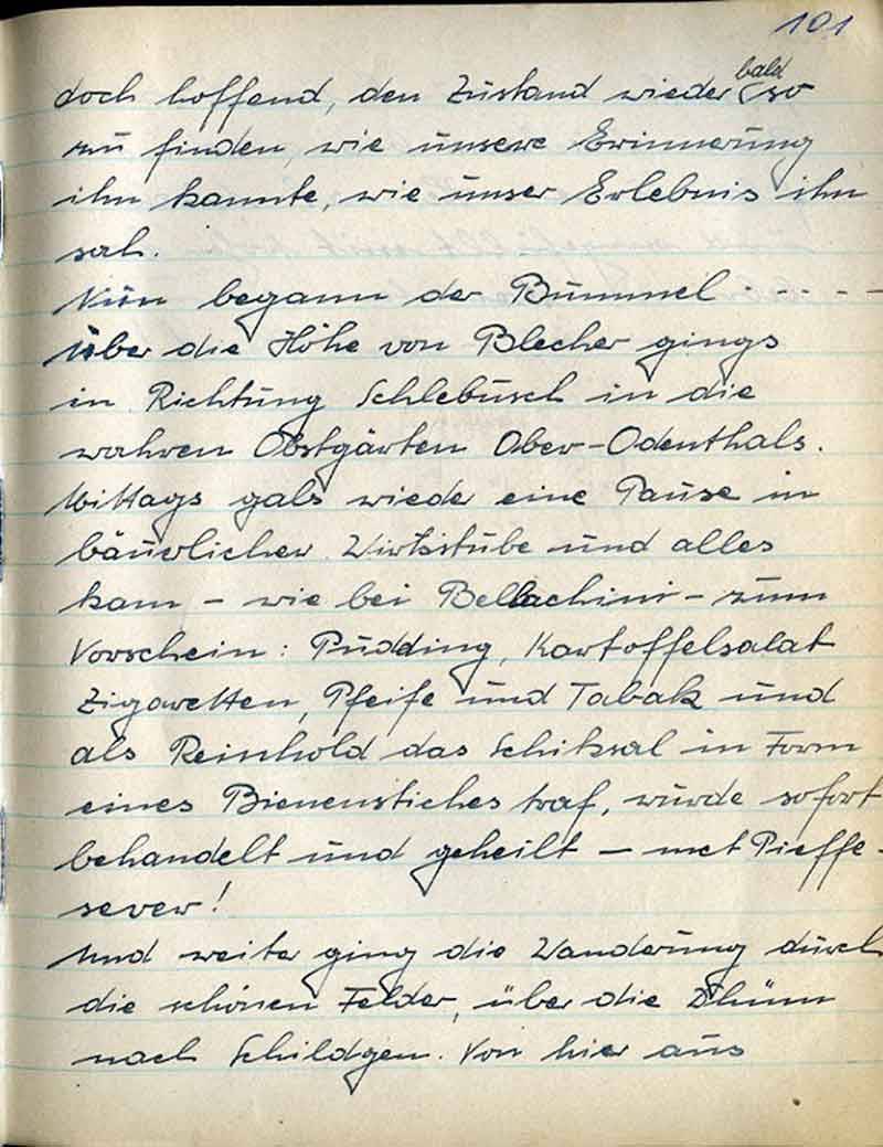 Nun begann der Bummel - - - - Über die Höhe von Blecher gings in Richtung Schlebusch in die wahren Obstgärten Ober-Odenthals. Mittags gabs wieder eine Pause in bäuerlicher Wirtsstube und alles kam – wie bei Bellachini – zum Vorschein. Pudding, Kartoffelsalat Zigaretten, Pfeife und Tabak und als Reinhold das Schiksal in Form eines Bienenstiches traf, wurde sofort behandelt und geheilt – mit Pieffesever!