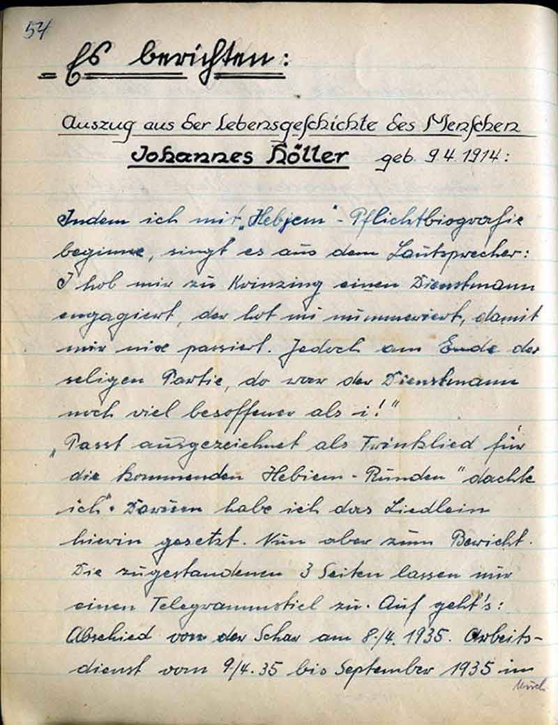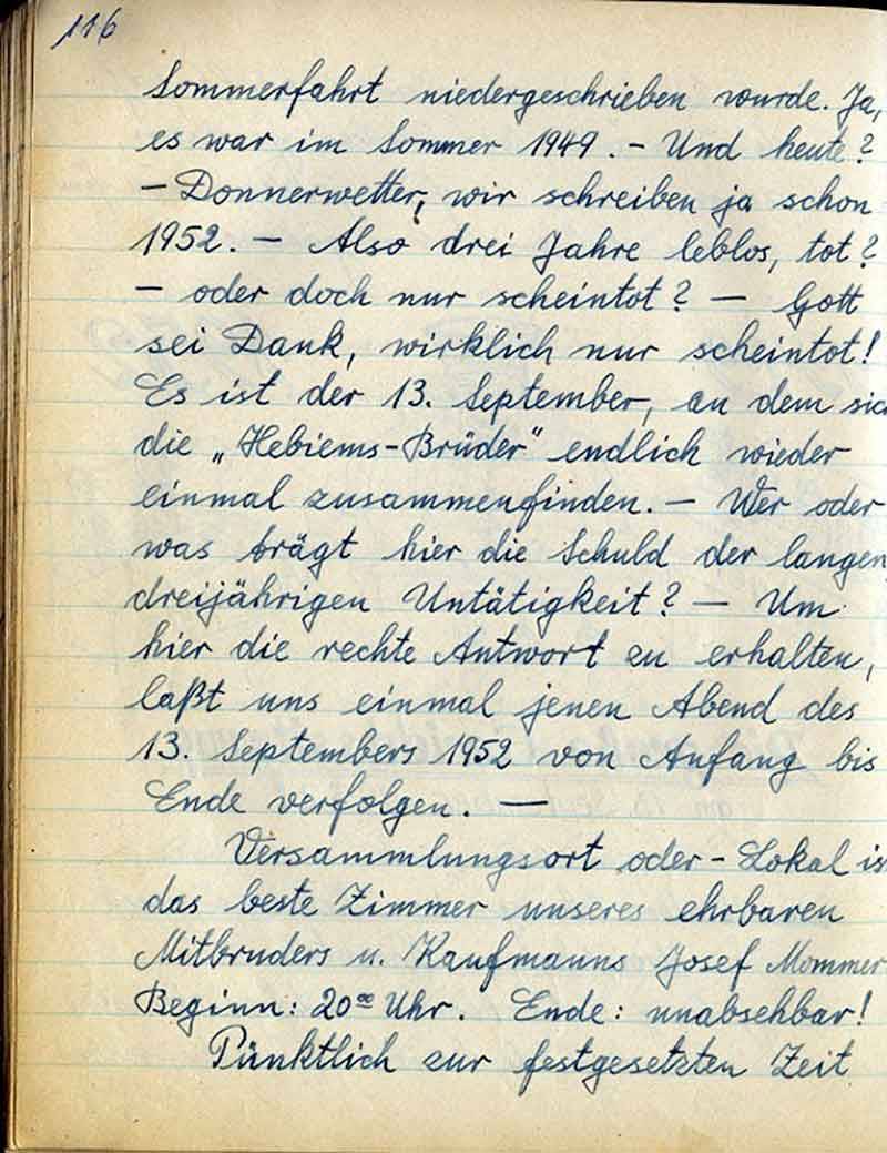 Sommerfahrt niedergeschrieben wurde. Ja, es war im Sommer 1949. – Und heute? – Donnerwetter, wir schreiben ja schon 1952. – Also drei Jahre leblos, tot? – oder doch nur scheintot? - Gott sei Dank, wirklich nur scheintot! Es ist der 13. September, an dem sich die „Hebiems-Brüder“ endlich wieder einmal zusammenfinden. – Wer oder was trägt hier die Schuld der langen dreijährigen Untätigkeit? – Um hier die rechte Antwort zu erhalten, lasst uns einmal jenen Abend des 13. September 1952 von Anfang bis Ende verfolgen. –