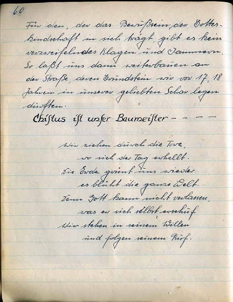 Mi klarem Willen der Wahrheit und damit Gott zu dienen, hart und einfach naturverbunden zu leben, in opferbereiter Brüderlichkeit Nächstenliebe zu üben, schlossen sich im Jahre 1929 Jungen zusammen und lebten fortan Jahr um Jahr miteinander ringend um Fortschritt – Gottes Gnaden, Gott-Erkenntnis!