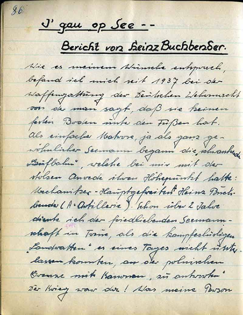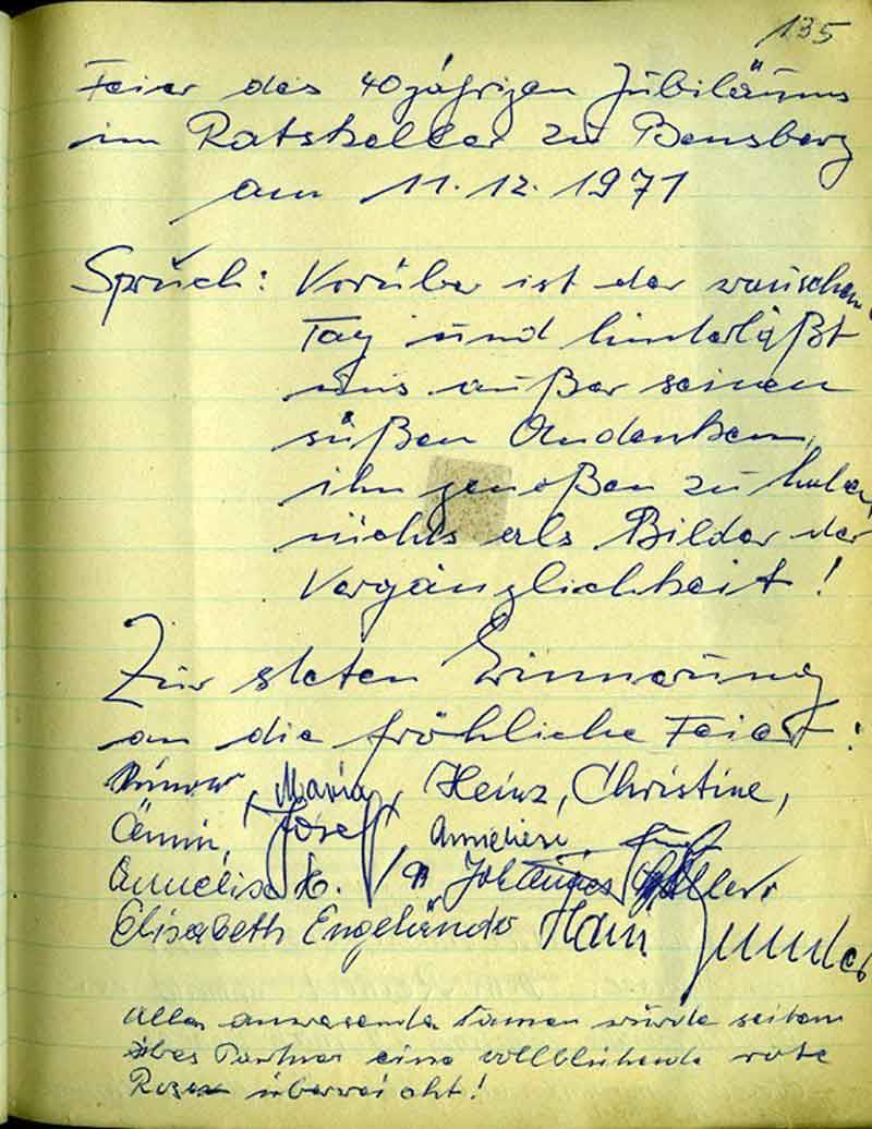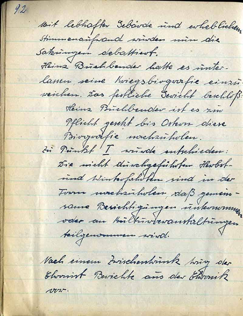 Heinz Buchbender hatte es unterlassen, seine Kriegsbiografie einzureichen. Das festliche Gericht beschloß: Heinz Buchbender ist es zur Pflicht gesetzt bis Ostern diese Biographie nachzuholen.