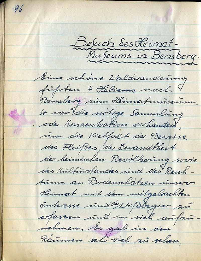 Eine schöne Waldwanderung führten 4 Hebiems nach Bensberg zum Heimatmuseum. So war die nötige Sammlung oder Konzentration vorhanden, um die Vielfalt der Beweise des Fleißes, der Gewandtheit der heimischen Bevölkerung sowie des Kulturstandes und des Reichtums an Bodenschätzen unserer Heimat mit dem mitgebrachten Interesse und der Wissbegier zu erfassen und in sich aufzunehmen. Es gab in den Räumen sehr viel zu sehen,