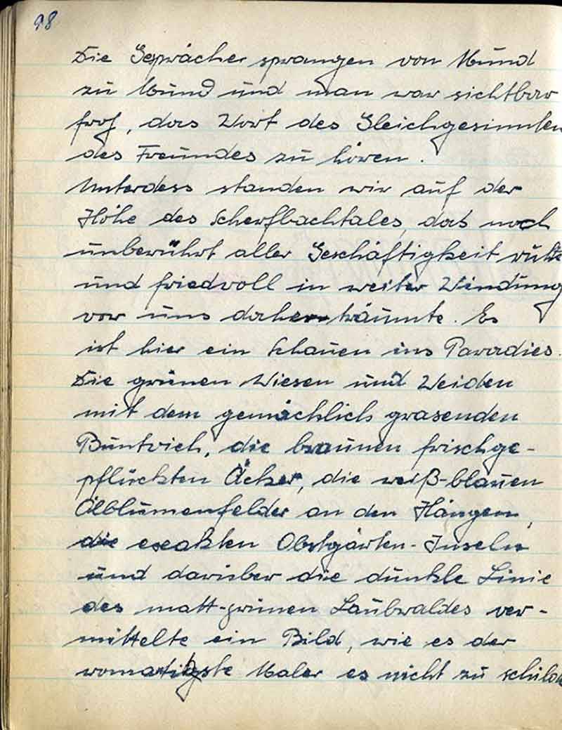 Unterdes standen wir auf der Höhe des Scherfbachtales, das noch unberührt aller Geschäftigkeit ruhig und friedvoll in weiter Windung vor uns daherträumte. Es ist hier ein Schauen ins Paradies. Die grünen Wiesen und Weiden mit dem gemächlich grasenden Buntvieh, die braunen frischgepflückten Äcker, die weiß-blauen Ölblumenfelder an den Hängen, die exakten Obstgärten-Inseln und darüber die dunkle Linie des mattgrünen Laubwaldes vermittelte ein Bild, wie es der romantischste Males es nicht zu schildern