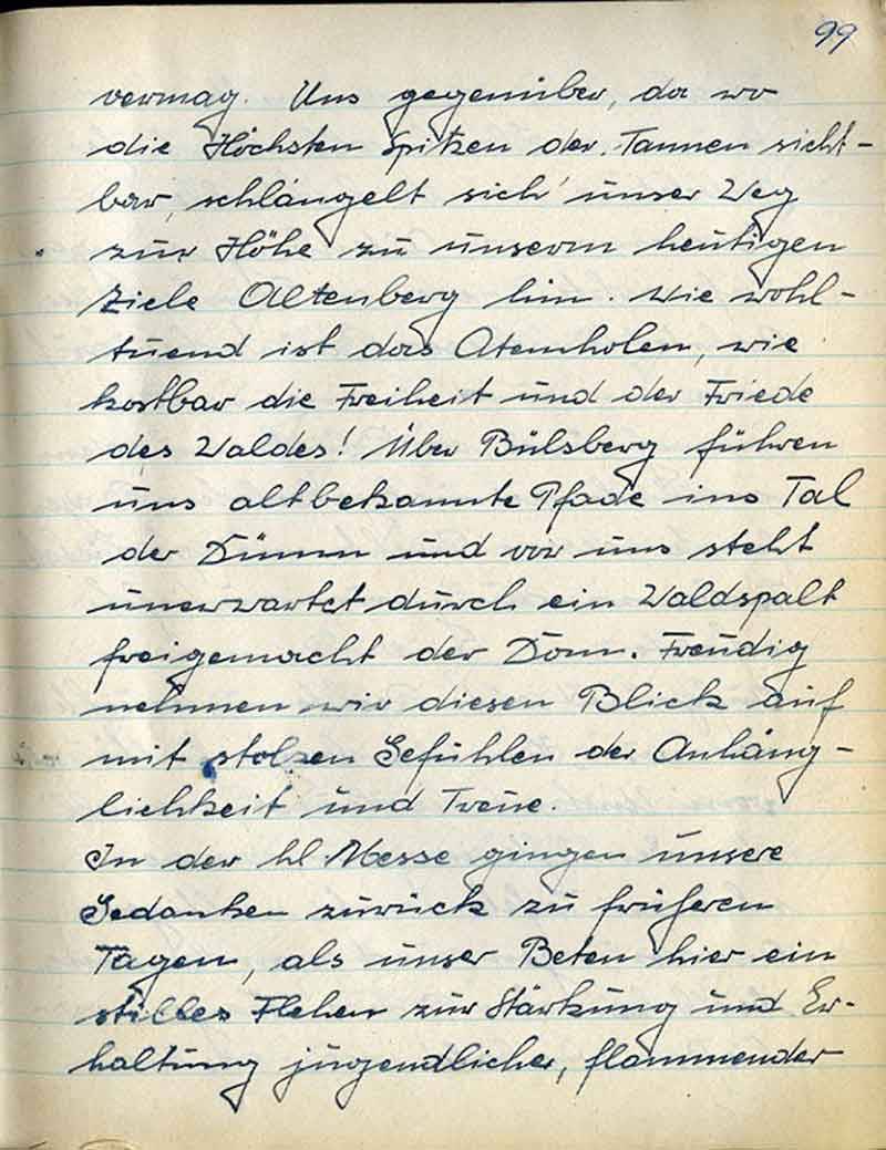 vermag. Uns gegenüber, da wo die Höchsten Spitzern der Tannen sichtbar, schlängelt sich unser Weg zur Höhe zu unserm heutigen Ziele Altenberg hin. Wie wohltuend ist das Atemholen, wie kostbar die Freiheit und der Friede des Waldes! Über Bülsberg führen uns altbekannte Pfade ins Tal der Dünn und vor uns steht unerwartet durch ein Waldspalt freigemacht der Dom. Freudig nehmen wir diesen Blick auf mit stolzen Gefühlen der Anhänglichkeit und Treue.