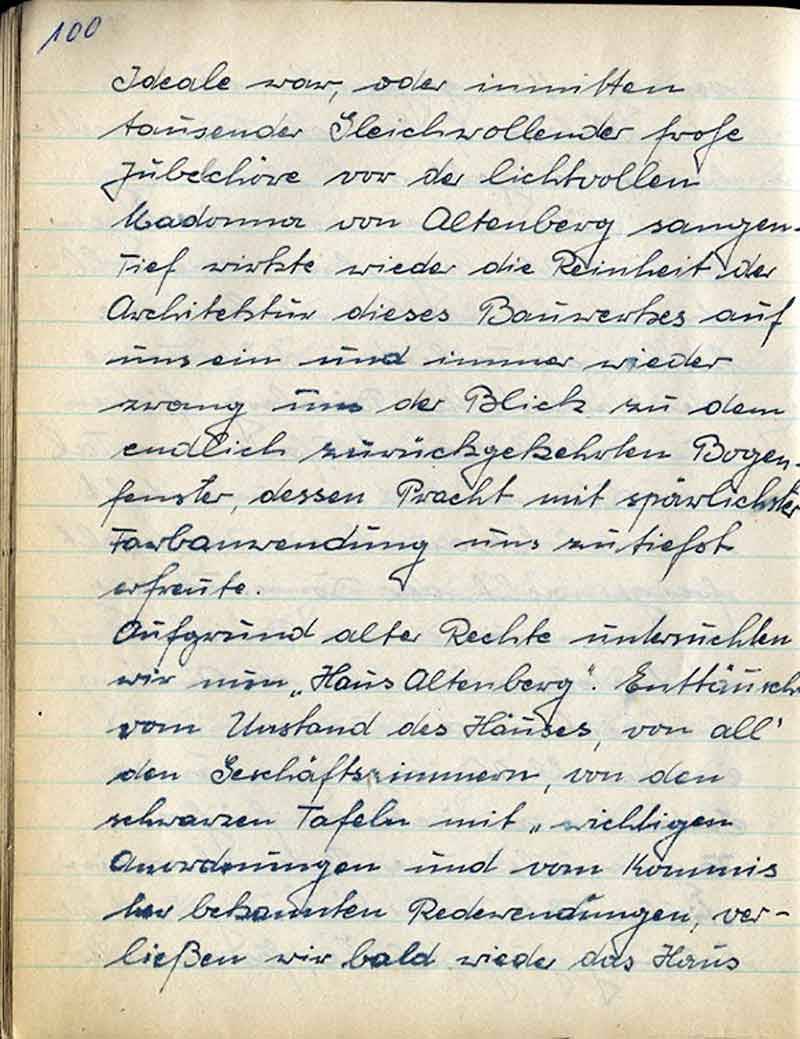 Aufgrund alter Rechte untersuchten wir nun „Haus Altenberg“. Enttäuscht vom Urstand des Hauses, von all’ den Geschäftszimmern, von den schwarzen Tafeln mit „wichtigen Anordnungen“ und vom Kommis her bekannten Redewendungen, verließen wir bald wieder das Haus=)/