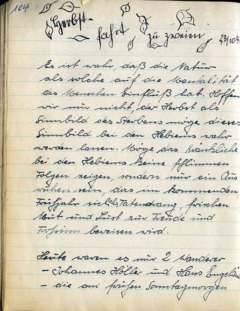 Es ist wahr, daß die Natur als solche auf die Mentalität des Menschen Einfluß hat. Hoffen wir nur nicht, der Herbst als Sinnbild des Sterbens möge dieses Sinnbild bei den Hebiems wahr werden lassen. Möge das Kränkliche bei den Hebiems keine schlimmen Folgen zeigen, sondern nur ein Ausruhen sein, das im kommenden Frühjahr sich als Tatendrang, frischen Mut und Lust zur Freude und Frohsinn beweisen wird.