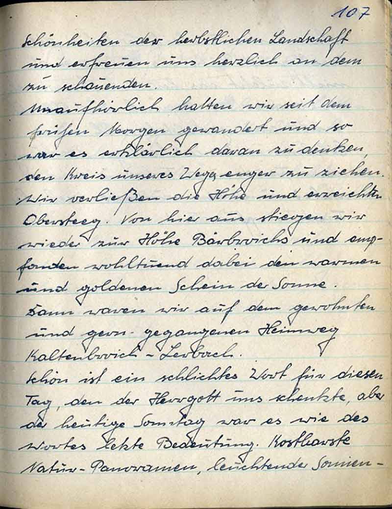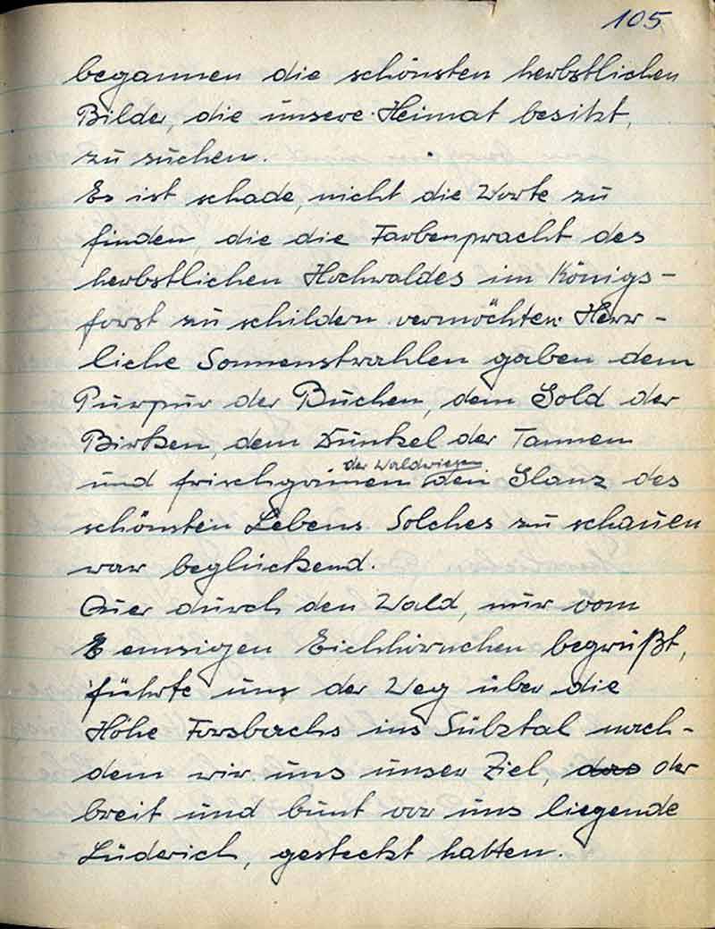 Es ist schade, nicht die Worte zu finden, die die Farbenpracht des herbstlichen Hochwaldes im Königsforst zu schildern vermöchten. Herrliche Sonnenstrahlen gaben dem Purpur der Buchen, dem Gold der Birken, dem Dunkel der Tannen und frischgrünen Waldwiesen den Glanz des schönsten Lebens. Solches zu schauen war beglückend.