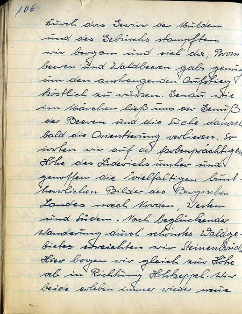 Durch das Gewirr der Mulden und des Gebüschs stampften wir bergan und sieh’ da, Brombeeren und Waldbeeren gabs genug um den anstrengenden Aufstieg köstlich zu würzen. Genau wie im Märchen ließ uns der Genuß der Beeren und die Suche danach bald die Orientierung verlieren. So irrten wir auf der farbenprächtigen Höhe des Lüderichs umher und genossen die vielfältigen bunt – herrlichen Bilder des Bergischen Landes nach Norden, Westen und Süden. Nach beglückender Wanderung durch schönstes Waldgebiet erreichten wir Steinenbrück. Hier bogen wir gleich zur Höhe ab in Richtung Hohkeppel. Wir beide erleben immer wieder neue