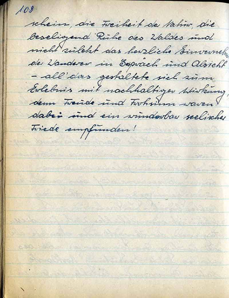 schein, die Freiheit der Natur, die beseligende Ruhe des Waldes und nicht zuletzt das herzliche Einvernehmen der Wanderer im Gespräch und Absicht – all’ das gestaltete sich zum Erlebnis mit nachhaltiger Wirkung, denn Freude und Frohsinn waren dabei und ein wunderbar seelischer Friede empfunden!
