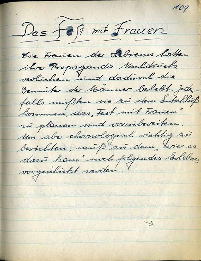 Die Frauen des Hebiems hatten ihrer Propaganda Nachdruck verliehen und dadurch die Gemüter der Männer belebt. Jedenfalls mußten sie zu dem Entschluß kommen, das „Fest der Frauen“ zu planen und vorzubereiten. Um aber chronologisch wichtig zu berichten, muß zu dem „wie es dazu kam“ noch folgendes Erlebnis vorgeschickt werden.