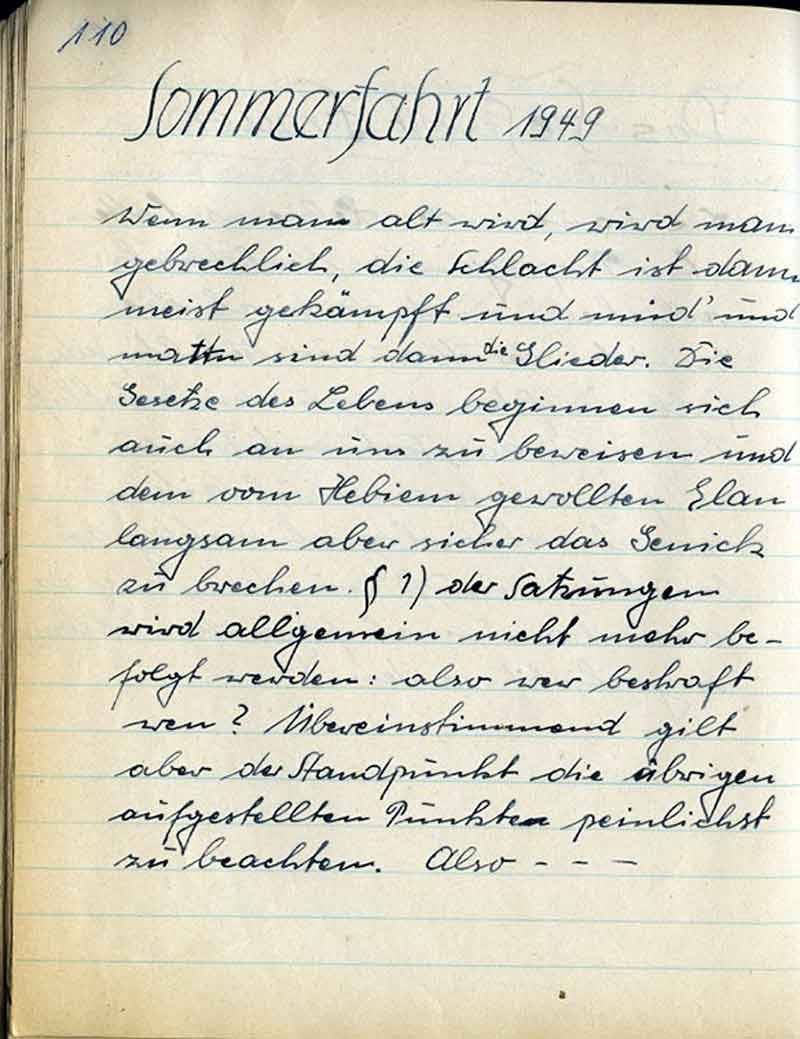 Wenn man alt wird, wird man gebrechlich, die Schlacht ist dann meist gekämpft und müd’ und matt sind dann die Glieder. Die Gesetze des Lebens beginnen sich auch an uns zu beweisen und dem vom Hebiem gewollten Elan langsam aber sicher das Genick zu brechen. § 1) der Satzungen wird allgemein nicht mehr befolgt werden: also wer bestraft wen? Übereinstimmend gilt aber der Standpunkt die übrigen aufgestellten Punkte peinlichst zu beachten. Also - - - -