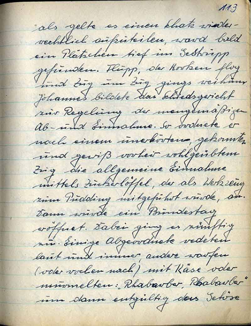 als gelte es einen Schatz widerrechtlich aufzuteilen, ward bald ein Plätzchen tief im Gestrüpp gefunden. Flupp, der Korken flog und Zug um Zug gings reihum. Johannes bildete das Schiedsgericht zur Regelung der mengenmäßigen Ab- und Einnahme. So ordnete er nach einem unerhörten, gekonnten und gewiß vorher wohlgeübten Zug die allgemeine Einnahme mittels Zuckerlöffel, der als Werkzeug zum Pudding mitgeführt wurde, an. Dann wurde ein Bundestag eröffnet. Dabei ging es zünftig zu. Einige Abgeordnete redeten laut und immer, andere warfen (oder reden nach) mit Käse oder murmelten: „Rhabarber, Rhabarber“ um dann entgültig das Getöse