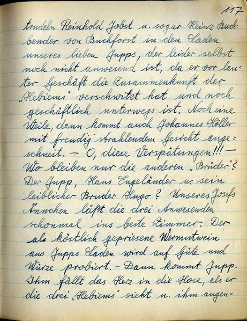 trudeln Reinhold Jobst u. sogar Heinz Buchbender von Buchforst in den Laden unseres lieben Jupps, der leider selbst noch nicht anwesend ist, da er vor lauter Geschäft die Zusammenkunft der „Hebiems“ verschwitzt hat und noch geschäftlich unterwegs ist. Noch eine Weile, dann kommt auch Johannes Höller mit freudig strahlendem Gesicht angeschneit. – O, diese Verspätungen!!! – Wo bleiben nur die anderen „Brüder“? Der Jupp, Hans Engeländer u. sein leiblicher Bruder Hugo? Unseres Josefs Ännchen läßt die drei Anwesenden schon mal ins beste Zimmer. Der als köstlich gepriesene Wermutwein aus Jupps Laden wird auf Güte und Würze probiert. – Dann kommt Jupp. Ihm fällt das Herz in die Hose, als er die drei „Hebiems“ sieht u. ihm augen-