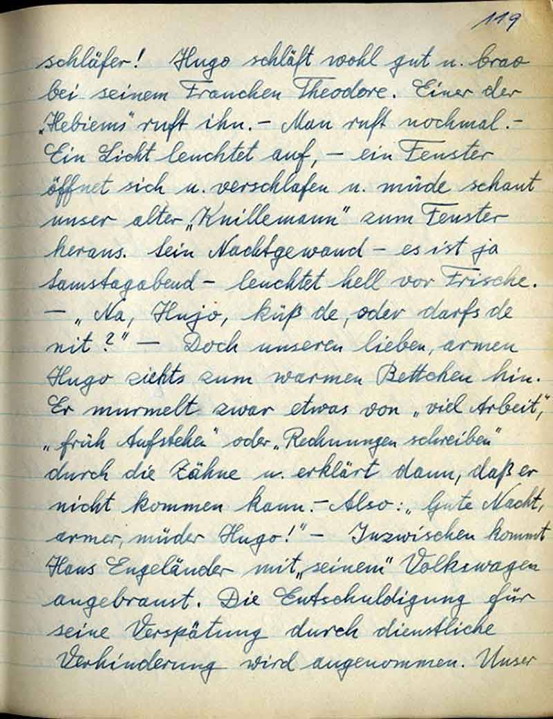 Schläfer! Hugo schläft wohl gut u. brav bei seinem Frauchen Theodore. Einer der „Hebiemi“ ruft ihn. – Man ruft noch mal. – Ein Licht leuchtet auf, - ein Fenster öffnet sich u. verschlafen u. müde schaut unser alter „Knillemann“ zum Fenster heraus. Sein Nachtgewand – es ist ja Samstagabend – leuchtet hell vor Frische. – „Na, Hujo, küß de, oder darfs de nit?“ – Doch unseren lieben, armen Hugo ziehts zum warmen Bettchen hin. Er murmelt zwar etwas von „viel Arbeit“, „früh Aufstehen“ oder „Rechnungen schreiben“ durch die Zähne u. erklärt dann, daß er nicht kommen kann. Also: „Gute Nacht, armer, müder Hugo!“ – Inzwischen kommt Hans Engeländer mit „seinem“ Volkswagen angebraust. Die Entschuldigung für seine Verspätung durch dienstliche Verhinderung wird angenommen. Unser