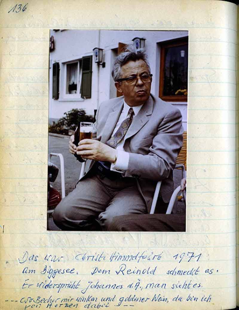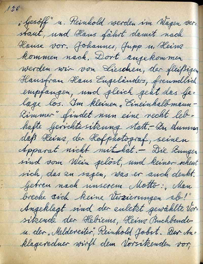 „Gesöff“ u. Reinhold werden im Wagen verstaut, und Hans fährt damit nach Hause vor. Johannes, Jupp u. Heinz kommen nach. Dort angekommen werden wir von Lieschen, der fleißigen Hausfrau Hans Engeländers, freundlich empfangen, und gleich geht das Gelage los. Im kleinen „Eineinhalbmann-Zimmer“ findet nun eine recht lebhafte Gerichtssitzung statt. – Zu dumm, daß Heinz, der Hofphotograf, seinen Apparat nicht mithat. – Die Zungen sind vom Wein gelöst, und keiner scheut sich, das zu sagen, was er auch denkt. Getreu nach unserem Motto: “Man breche sich keine Verzierungn ab!“ Angeklagt sind der zuletzt gewählte Vorsitzende der Hebiems, Heinz Buchbender – u. der „Meldereiter“, Reinhold Jobst. Der Anklageredner wirft dem Vorsitzenden vor,