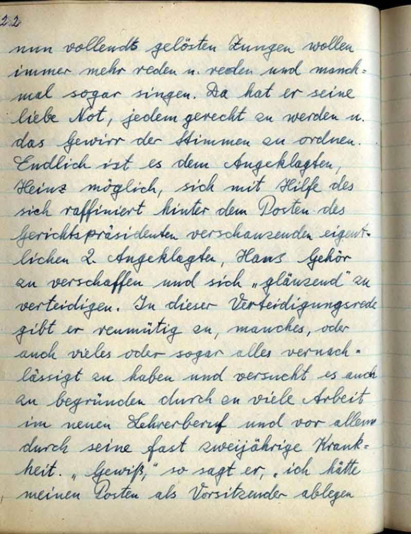 nun vollends gelösten Zungen wollen immer mehr reden u. reden und manchmal sogar singen. Da hat er seine liebe Not, jedem gerecht zu werden u. das Gewirr der Stimmen zu ordnen. Endlich ist es dem Angeklagten, Heinz möglich, sich mit Hilfe des sich raffiniert hinter dem Posten des Gerichtspräsidenten verschanzenden eigentlichen 2. Angeklagten, Hans Gehör zu verschaffen und sich „glänzend“ zu verteidigen. In dieser Verteidigungsrede gibt er reumütig zu, manches, oder auch vieles oder sogar alles vernachlässigt zu haben und versucht es auch zu begründen durch zu viele Arbeit im neuen Lehrerberuf und vor allem durch seine fast zweijährige Krankheit. „Gewiß“, so sagt er, „ich hätte meinen Posten als Vorsitzender ablegen