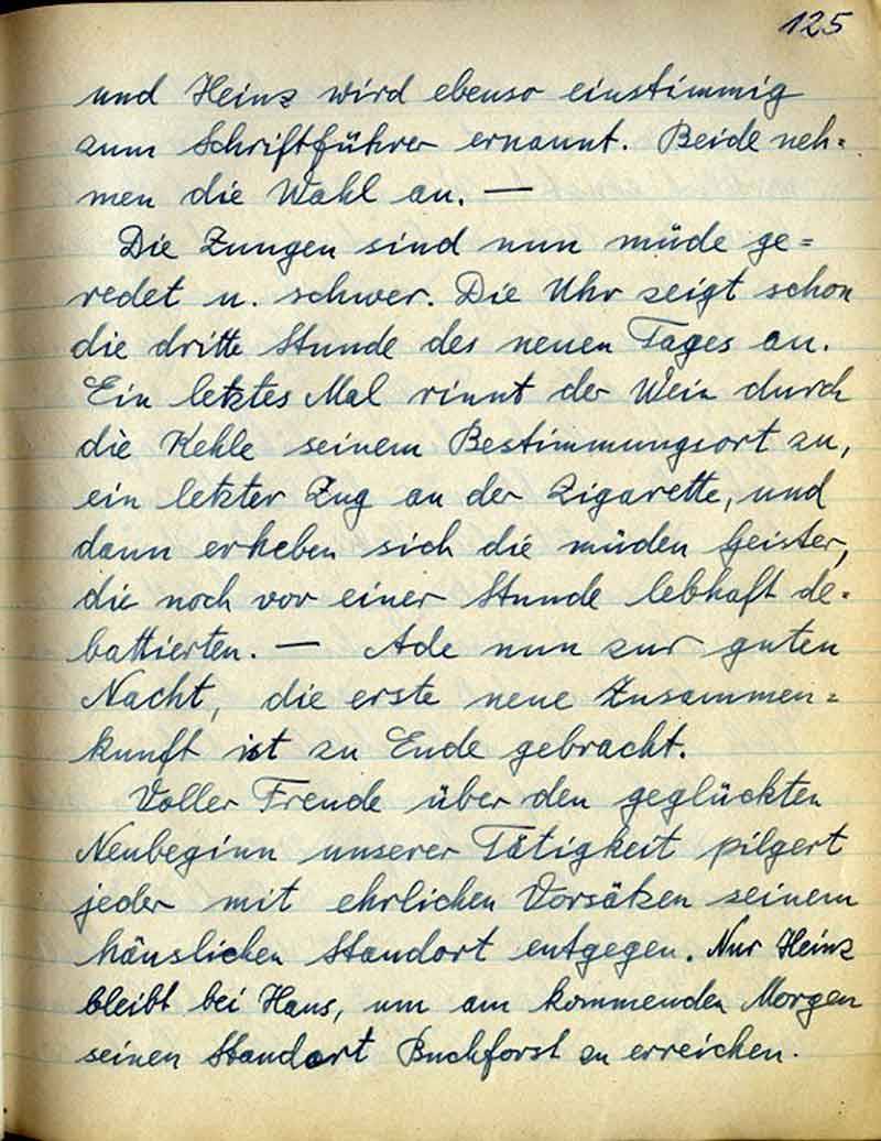 Die Zungen sind nun müde geredet u. schwer. Die Uhr zeigt schon die dritte Stunde des neuen Tages an. Ein letztes Mal rinnt der Wein durch die Kehle seinem Bestimmungsort zu, ein letzter Zug an der Zigarette, und dann erheben sich die müden Geister, die noch vor einer Stunde lebhaft debattierten. - - Ade nun zur guten Nacht, die erste neue Zusammenkunft ist zu Ende gebracht.