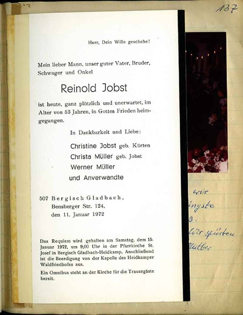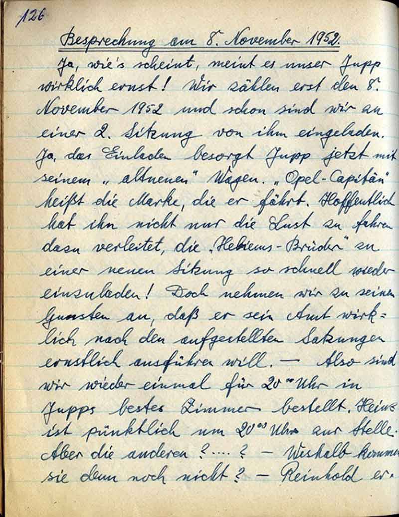 Ja, wie’s scheint, meint es unser Jupp wirklich ernst! Wir zählen erst den 8. November 1952 und schon sind wir zu einer 2. Sitzung von ihm eingeladen. Ja, das Einladen besorgt Jupp jetzt mit seinem „altneuen“ Wagen. „Opel-Capitän“ heißt die Marke, die er fährt. Hoffentlich hat ihn nicht nur die Lust zu fahren dazu verleitet, die „Hebiems-Bruder“ zu einer neuen Sitzung so schnell wieder einzuladen! Doch nehmen wir zu seinen Gunsten an, daß er sein Amt wirklich nach den aufgestellten Satzungen ernstlich ausführen will. – Also sind wir wieder einmal für 2000 Uhr in Jupps bestes Zimmer bestellt. Heinz ist pünktlich um 2000 Uhr zur Stelle. Aber die anderen? …..? – Weshalb kommen sie denn noch nicht?- Reinhold er