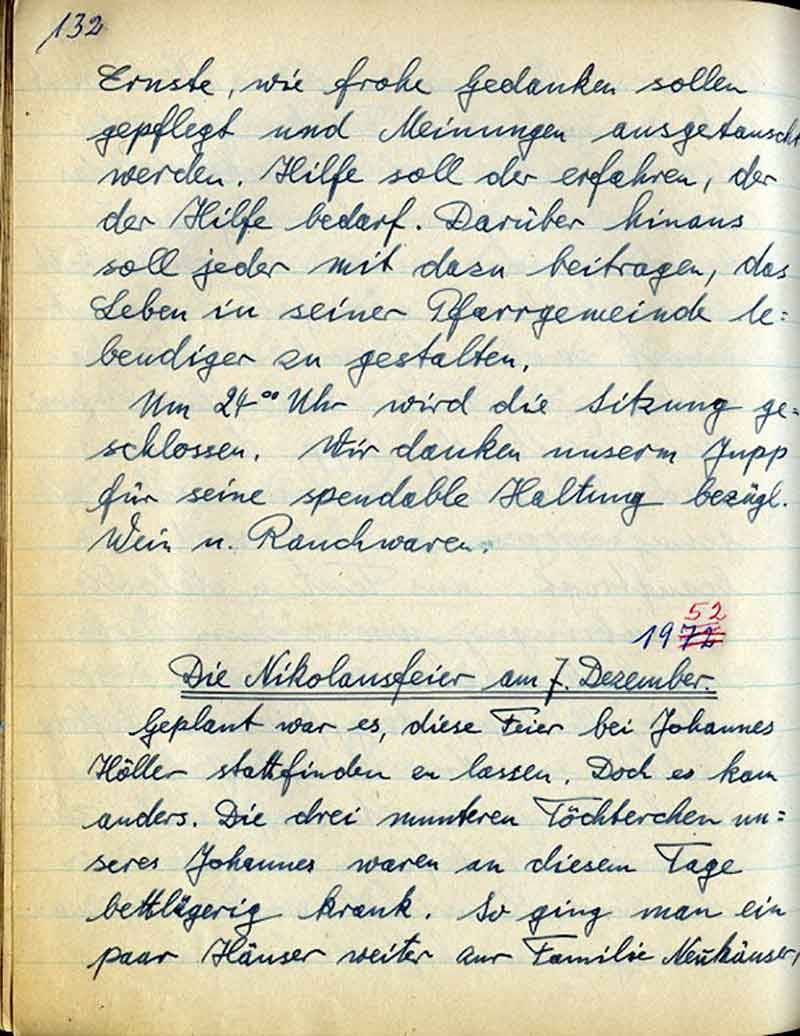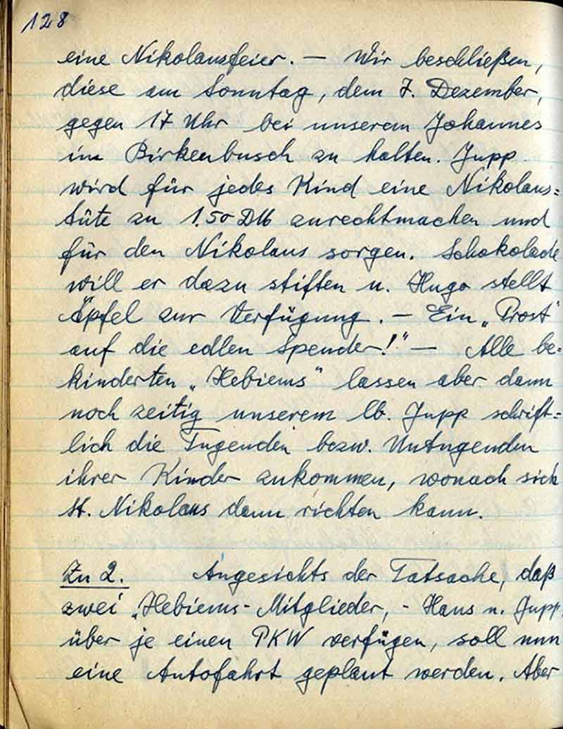 eine Nikolausfeier. – Wir beschließen, diese am Sonntag, dem 7. Dezember, gegen 17 Uhr bei unserem Johannes im Birkenbusch zu halten. Jupp wird für jedes Kind eine Nikolaustüte zu 1.50 DM zurechtmachen und für den Nikolaus sorgen. Schokolade will er dazu stiften u. Hugo stellt Äpfel zur Verfügung. – Ein „Prost“ auf die edlen Spender! – Alle bekinderten „Hebiems“ lassen aber dann noch zeitig unserem lb. Jupp schriftlich die Tugenden bezw. Untugenden ihrer Kinder zukommen, wonach sich St. Nikolaus dann richten kann.
