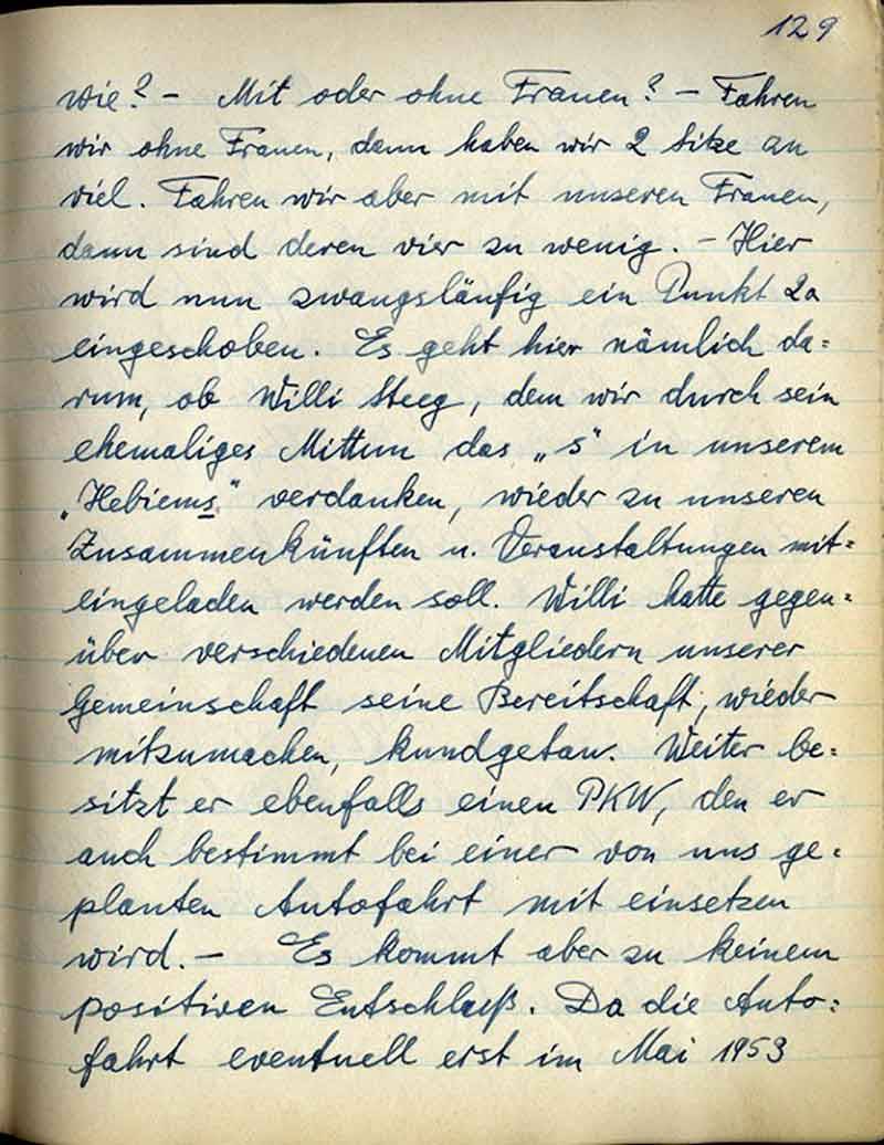 wie? - Mit oder ohne Frauen? – Fahren wir ohne Frauen, dann haben wir 2 Sitze zu viel. Fahren wir aber mit unseren Frauen, dann sind deren vier zu wenig. – Hier wird nun zwangsläufig ein Punkt 2a eingeschoben. Es geht hier nämlich darum, ob Willi Steeg, dem wir durch sein ehemaliges Mittun das „s“ in unserem „Hebiems“ verdanken, wieder zu unseren Zusammenkünften u. Veranstaltungen miteingeladen werden soll. Willi hatte gegenüber verschiedenen Mitgliedern unserer Gemeinschaft seine Bereitschaft, wieder mitzumachen, kundgetan. Weiter besitzt er ebenfalls einen PKW, den er auch bestimmt bei einer von uns geplanten Autofahrt mit einsetzen wird. – Es kommt aber zu einem positiven Entschluß. Da die Autofahrt eventuell erst im Mai 1953