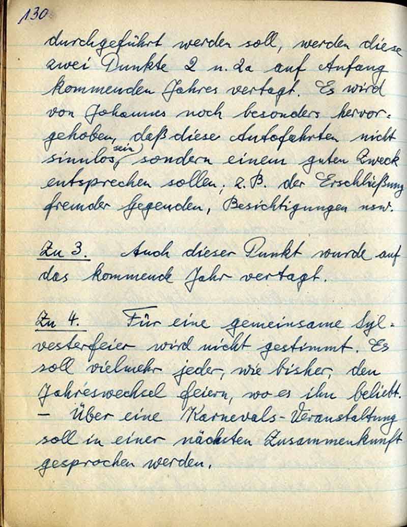 durchgeführt werden soll, werden diese zwei Punkte 2 u. 2a, auf Anfang kommenden Jahres vertagt. Es wird von Johannes noch besonders hervorgehoben, daß diese Autofahrten nicht sinnlos sein sondern einem guten Zweck entsprechen sollen; z.B. der Erschließung fremder Gegenden, Besichtigungen usw.