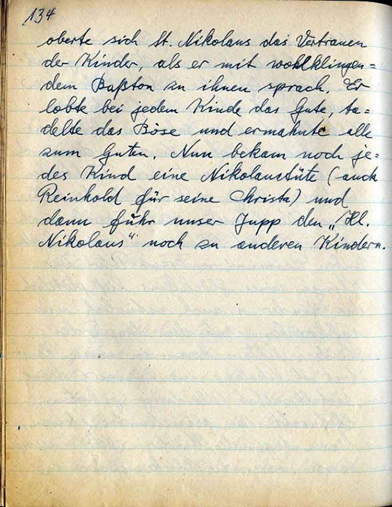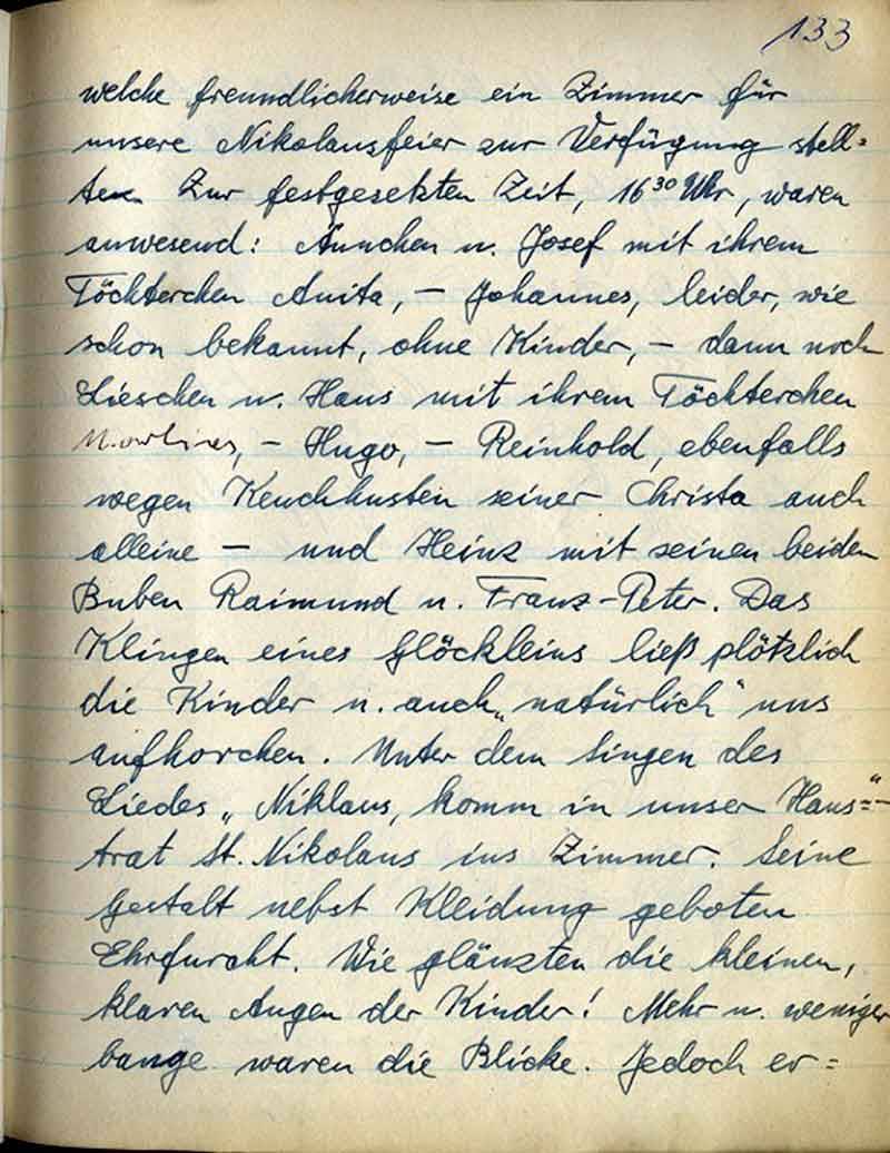 welche freundlicherweise ein Zimmer für unsere Nikolausfeier zur Verfügung stellten. Zur festgesetzten Zeit, 1630 Uhr, waren anwesend: Ännchen u. Josef mit ihrem Töchterchen Anita, - Johannes, leider, wie schon bekannt, ohne Kinder, - dann noch Lieschen u. Hans mit ihrem Töchterchen Martina, - Hugo, - Reinhold, ebenfalls wegen Keuchhusten seiner Christa auch alleine – und Heinz mit seinen beiden Buben Raimund u. Franz-Peter. Das Klingen eines Glöckleins ließ plötzlich die Kinder u,. auch „natürlich“ uns aufhorchen. Unter dem Singen des Liedes „Niklaus, komm in unser Haus“ – trat St. Nikolaus ins Zimmer. Seine Gestalt nebst Kleidung geboten Ehrfurcht. Wie glänzten die kleinen, klaren Augen der Kinder! Mehr u. weniger bange waren die Blicke. Jedoch er-
