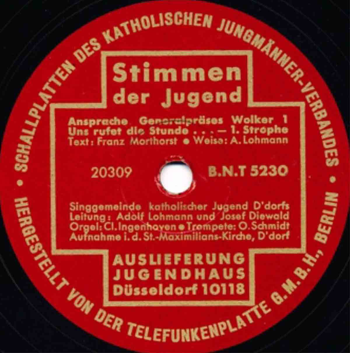 Neben alten und neuen Liedern von und mit Adolf Lohmann und Georg Thurmair umfasst die aus insgesamt sieben Folgen mit jeweils mehreren Schallplatten bestehende Serie Reden von Ludwig Wolker, dem Generalpräses des KJMVD. Die Schallplatten kamen in den Jahren der NS-Diktatur und – vielleicht noch stärker? - auch während des Krieges deutschlandweit in den Gruppenstunden des Verbandes und nach dessen Verbot in den Gruppenstunden der Pfarrjugend zum Einsatz und fanden entsprechend große Verbreitung. Konkrete Zahlen hierzu fehlen bislang jedoch gänzlich. Betrachtet man aber die jeweiligen Gebrauchsspuren der von der Telefunken GmbH in Berlin gepressten Platten, so wurden sie sicherlich häufig benutzt. Das gilt vor allem für die sechste Platte der sechsten Folge mit der Ansprache des damaligen Kardinalstaatssekretärs Eugenio Pacelli - dem späteren Papst Pius XII - an die deutsche Jugend. Sie wurde im April 1937 veröffentlicht, also kurz nach der Enzyklika „Mit brennender Sorge“. Während die einzelnen Reihen entweder in Altenberg oder in Düsseldorf aufgenommen wurden, so widmet sich diese sechste Reihe ausschließlich Rom. Unter dem Titel „Tu es Petrus“ ist dort neben Pacelli Musik – unter anderem aus der Sixtinischen Kapelle - zu hören. Es ist aber bekannt, dass auch während des Krieges noch Aufnahmen in der Kölner Kirche St. Maria im Kapitol aufgenommen wurden.