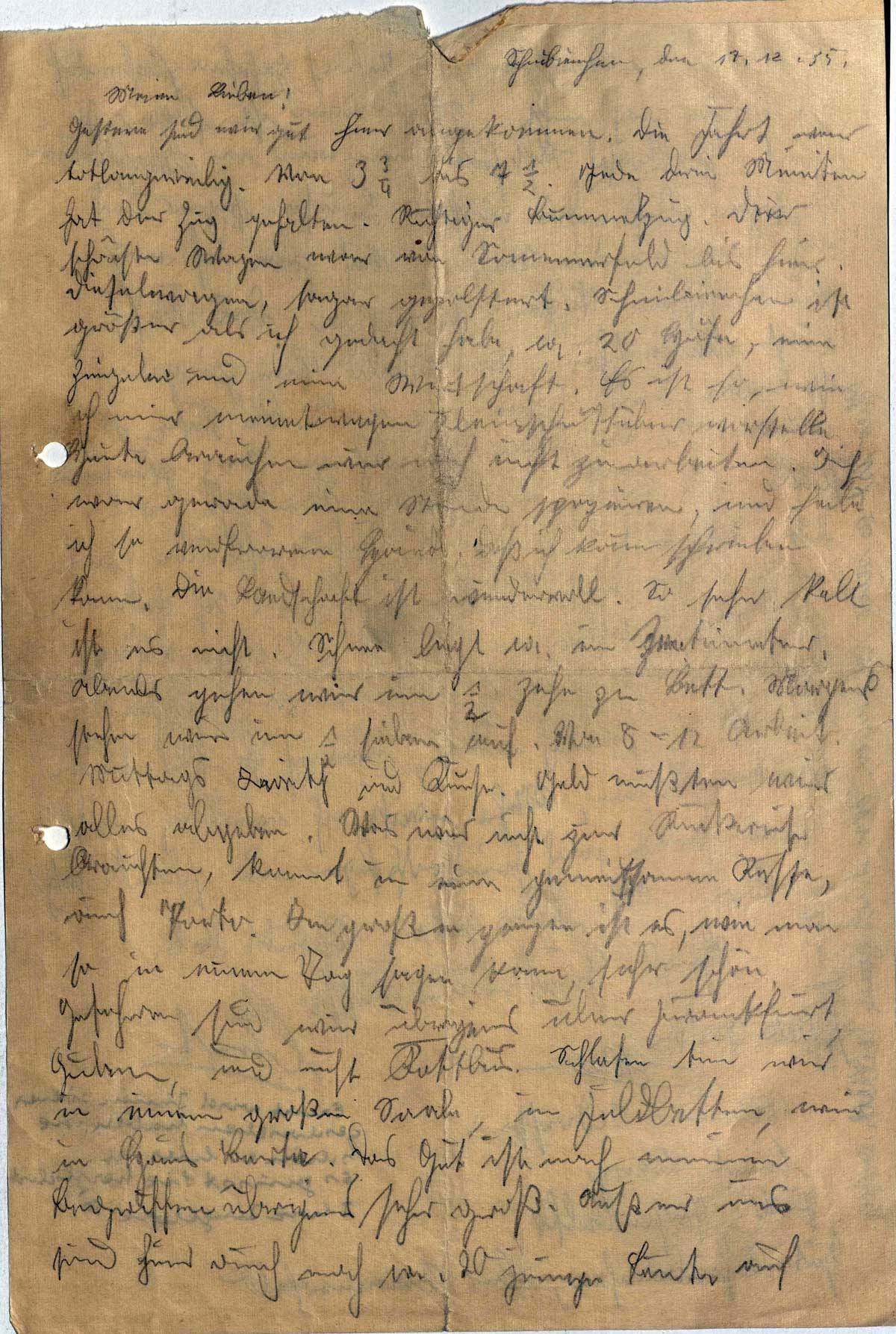 Gestern sind wir gut hier angekommen. Die Fahrt war totlangweilig. Von 3 ¾ bis 7 ½. Alle drei Minuten hat der Zug gehalten. Richtiger Bummelzug. Der schönste Wagen war ein Sommerfeld bis hier. Dieselwagen, sogar gepolstert. Schniebinchen ist größer, als ich gedacht habe, ca. 20 Höfe, eine Ziegelei und eine Wirtschaft. Es ist so, wie ich mir meinetwegen Kleinschüttüber vorstelle. Heute brauchen wir noch nicht zu arbeiten. Ich war gerade eine Stunde spazieren, und habe ich so verfrorene Hände, daß ich kaum schreiben kann. Die Landschaft ist wundervoll. So sehr kalt ist es nicht. Schnee liegt ca. ein Zentimeter. Abends gehen wir um ½ Zehn zu Bett. Morgens stehen wir um ½ sieben auf. Von 8-12 Arbeit. Mittags Iwrith und Kurse. Geld mußten wir alles abgeben. Was wir nicht zur Rückreise brauchten, kommt in eine gemeinsame Kasse, auch Porto. Im großen ganzen ist es, wie man so in einem Tag sagen kann, sehr schön. Gefahren sind wir übrigens über Frankfurt, [..], und nicht Kottbus. Schlafen tun wir in einem großen Saale, in Feldbetten, wie in Haus Berta. Das Gut ist nach meinen Begriffen übrigens sehr groß. Außer uns sind hier auch noch ca. 20 junge Leute auf