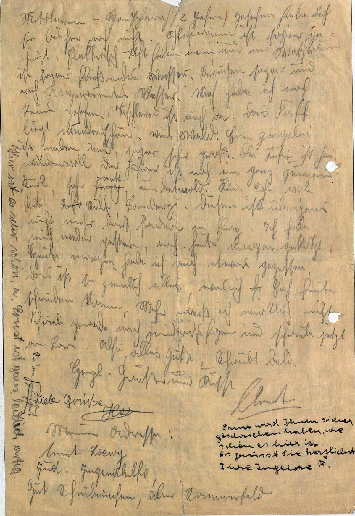 Mittleren-Hachscharah (2 Jahre). Gesehen habe ich sie bisher noch nicht. Schlafraum ist sogar geheizt. Elektrisch Licht haben wir, und im Waschraum ist sogar fließendes Wasser. Brausen sogar und auch angewärmtes Wasser. Vieh habe ich noch keins gesehen. Tischlerei ist auch da. Das Kaff liegt wunderschön, viel Wald. Eine Ziegelei ist neben uns, sogar sehr groß. Die Luft ist hier wundervoll. Der Führer ist noch ein ganz junger Kerl, sehr nett, aus Detmold. Kein Sohn von Rab. Rülf, Bamberg. Dieser ist übrigens nicht mehr dort, sondern in Erez. Ich habe mich weder gestern, noch heute morgen gekotzt. Heute morgen habe ich auch etwas gegessen. Das ist so ziemlich alles, was ich Euch heute schreiben kann. Mehr weiß ich wirklich nicht. Schrieb gerade noch Friedrichshagen und schreibe jetzt an Lore.