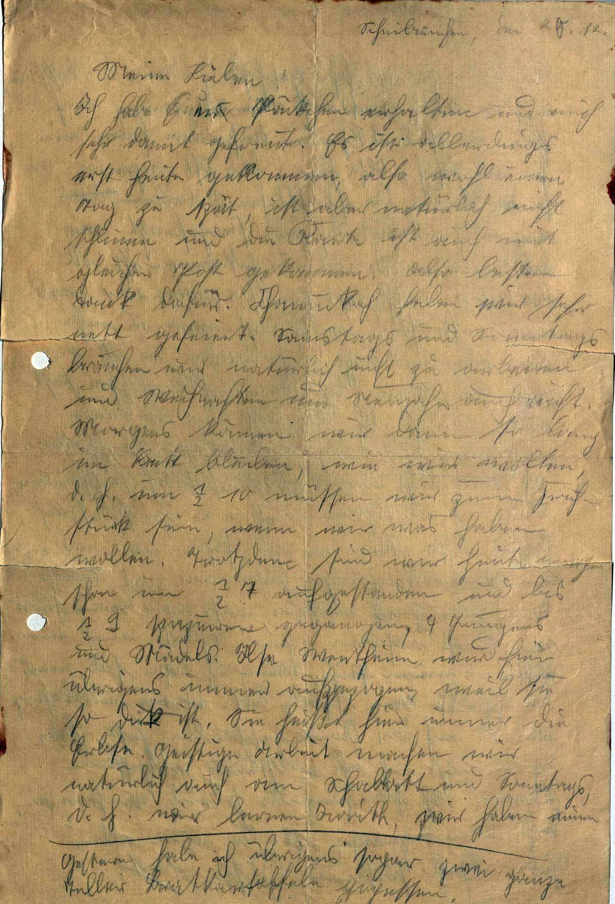 Ich habe Euer Päckchen erhalten und mich sehr damit gefreut. Es ist allerdings erst heute angekommen, also wohl einen Tag zu spät, ist aber natürlich nicht schlimm und die Karte ist auch mit gleicher Post gekommen. Also besten Dank dafür. Chanukah haben wir sehr nett gefeiert. Samstags und Sonntags brauchen wir natürlich nicht zu arbeiten und Weihnachten und Neujahr auch nicht. Morgens können wir dann so lang im Bett bleiben, wie wir wollen, d. h. um ½ 10 müssen wir zum Frühstück sein, wenn wir was haben wollen. Trotzdem sind wir heute morgen schon um ½ 7 aufgestanden und bis ½ 9 spazieren gegangen, 4 Jungens und Mädels. Ilse Wertheim wird hier übrigens immer aufgezogen, weil sie so dick ist. Sie heißt hier immer die Erbse. Geistige Arbeit machen wir natürlich auch am Schachbrett und Sonntags, d. h. wir lernen Iwrith, wir haben einen