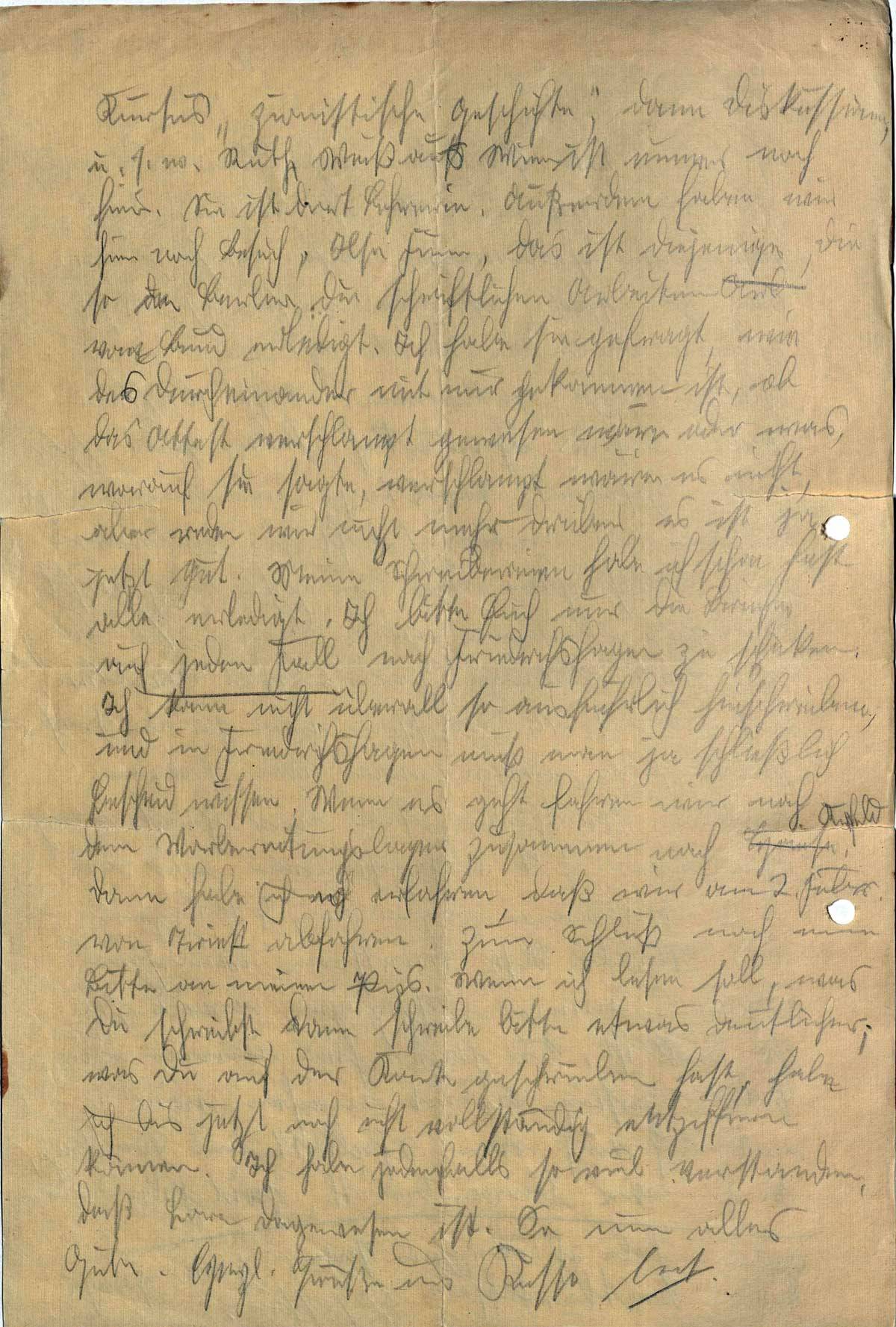 Kursus „zionistische Geschichte”, dann Diskussion, u.s.w. Ruth Weiß aus Wien ist immer noch hier. Sie ist dort Lehrerin. Außerdem haben wir hier noch Besuch, Ilse Finn, das ist diejenige, die so in Berlin die schriftlichen Arbeiten vom Bund erledigt. Ich habe sie gefragt, wie das Durcheinander mit mit gekommen ist, ob das Attest verschlampt gewesen wäre oder was, worauf sie sagte, verschlampt wäre es nicht, aber reden wir nicht mehr drüber, es ist ja jetzt gut. Meine Schreibereien habe ich schon fast alle erledigt. Ich bitte Euch nur die Briefe auf jeden Fall nach Friedrichshafen zu schicken. Ich kann nicht überall so ausführlich hinschreiben, und in Friedrichshafen muß man ja schließlich Bescheid wissen. Wenn es geht fahren wir nach dem Vorbereitungslagaer zusammen nach Krefeld. Dann habe ich noch erfahren, daß wir am 2. Febr. von Triest abfahren. Zum Schluß noch eine Bitte an meinen Pips. Wenn ich lesen soll, was Du schreibst, dann schreibe bitte etwas deutlicher; was Du auf der Karte geschrieben hast, habe ich bis jetzt noch nicht vollständig entziffern können. Ich habe jedenfalls so viel verstanden, daß Lore dagewesen ist. So nun alles Gute. Herzl. Grüße und Küsse Ernst.