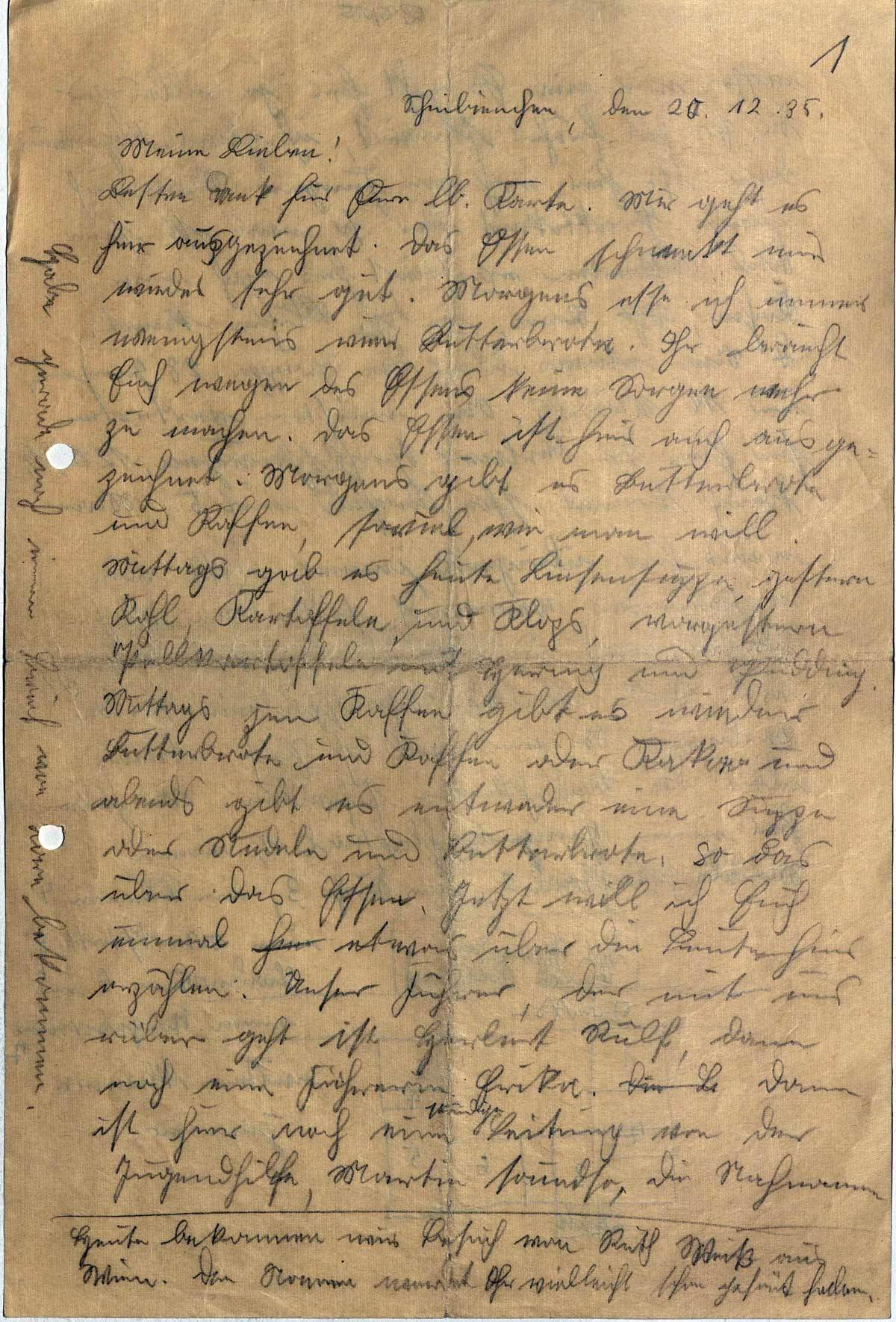 Besten Dank für Eure lb. Karte. Mir geht es hier ausgezeichnet. Das Essen schmeckt mir wieder sehr gut. Morgens esse ich immer wenigstens vier Butterbrote. Ihr braucht Euch wegen des Essens keine Sorge mehr zu machen. Das Essen ist hier auch ausgezeichnet. Morgens gibt es Butterbrote und Kaffee, soviel, wie man will. Mittags gab es heute Linsensuppe, gestern Kohl, Kartoffeln und Klops, vorgestern Pellkartoffeln mit Hering und Pückling. Mittags zum Kaffee gibt es wieder Butterbrote und Kaffee oder Kakao und abends gibt es entweder eine Suppe oder Nudeln und Butterbrote. So das über das Essen. Jetzt will ich Euch einmal etwas über die Leute hier erzählen. Unser Führer, der mit uns rüber geht, ist Herbert Rülf, dann noch eine Führerin Erika. Dann ist hier noch eine ständige Leitung von der Jugendhilfe, Martin soundso, die Nachnamen