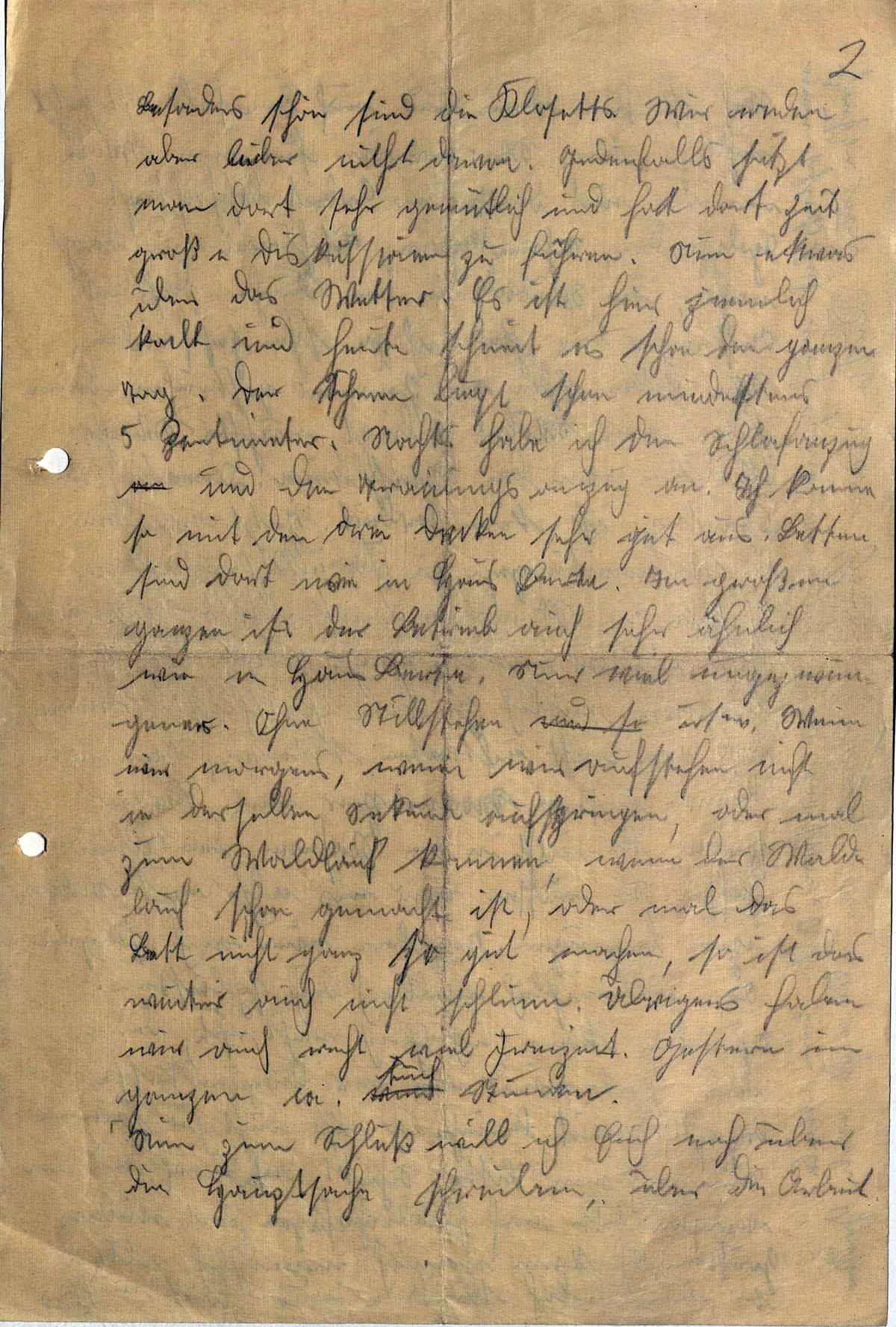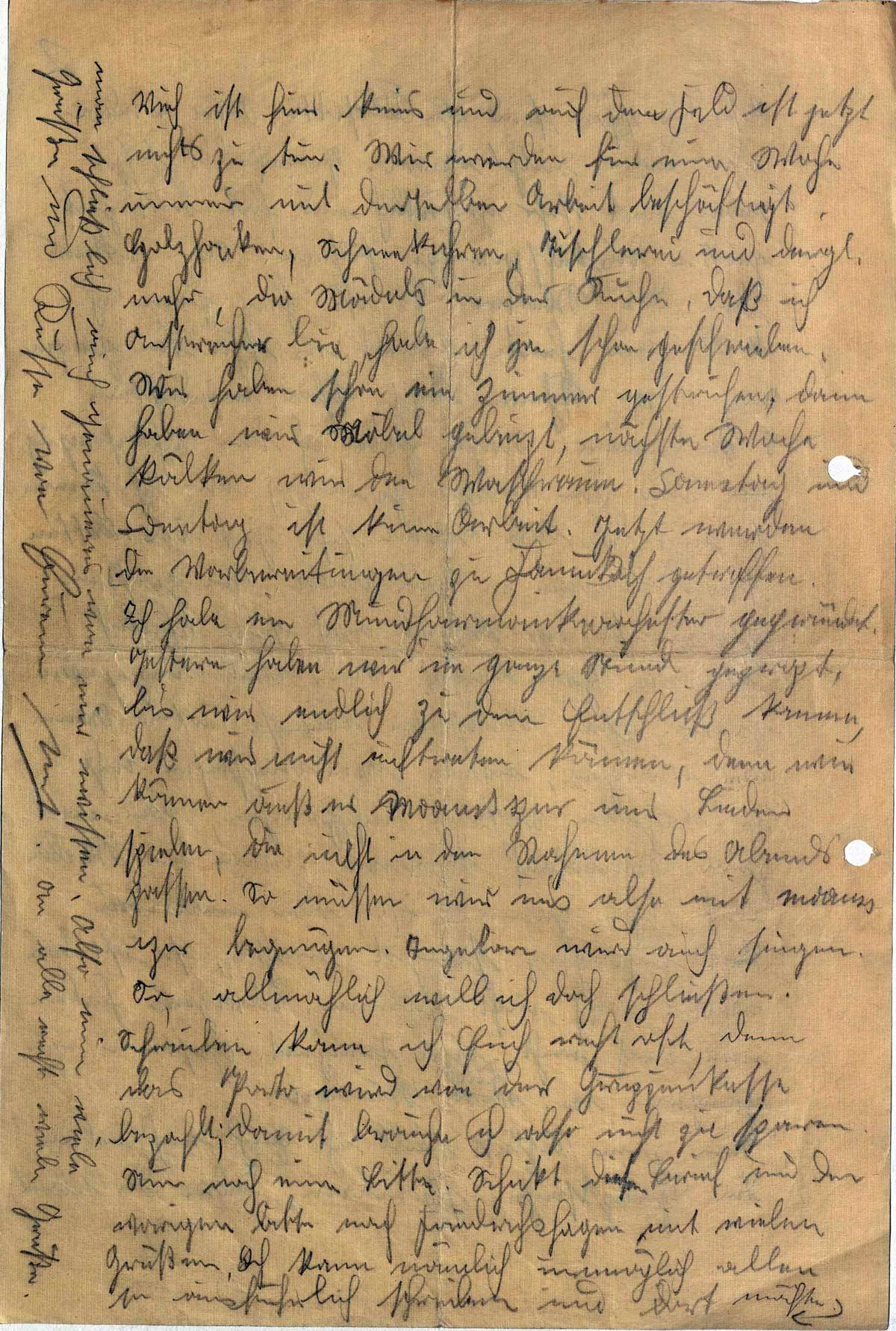 So, allmählich will ich doch schließen. Schreiben kann ich Euch nicht oft, denn das Porto wird von der Gruppenkasse bezahlt; damit brauche ich also nicht zu sparen. Nun noch eine Bitte. Schickt diesen Brief und den vorigen bitte nach Friedrichshafen mit vielen Grüßen. Ich kann nämlich unmöglich allen so ausführlich schreiben und dort möchte