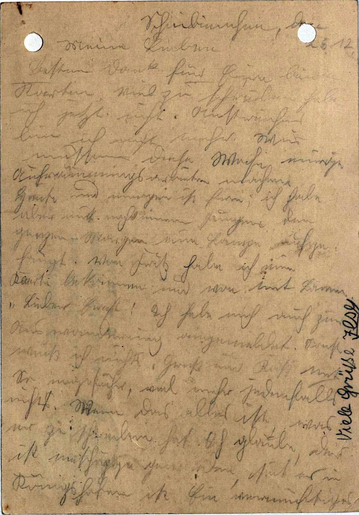 Heute und morgen ist frei; ich habe aber mit noch einem Jungen den ganzen Morgen eine Lampe aufgehängt. Von Fritz habe ich eine Karte bekommen und von [..]. „Lieber Ernst! Ich habe mich auch zur Auswanderung angemeldet. Sonst weiß ich nichts. Gruß und Kuß Ernst.