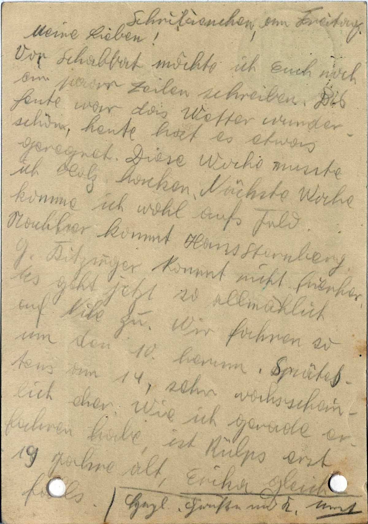 Nachher kommt Hans Sternberg. G. Kitzinger kommt nicht hierher. Es geht jetzt so allmählich auf Nibe zu. Wir fahren so um den 10. herum. Spätestens am 14, schon wahrscheinlich eher. Wie ich gerade erfahren habe, ist Rülps erst 19 Jahre alt, Erika gleichfalls.