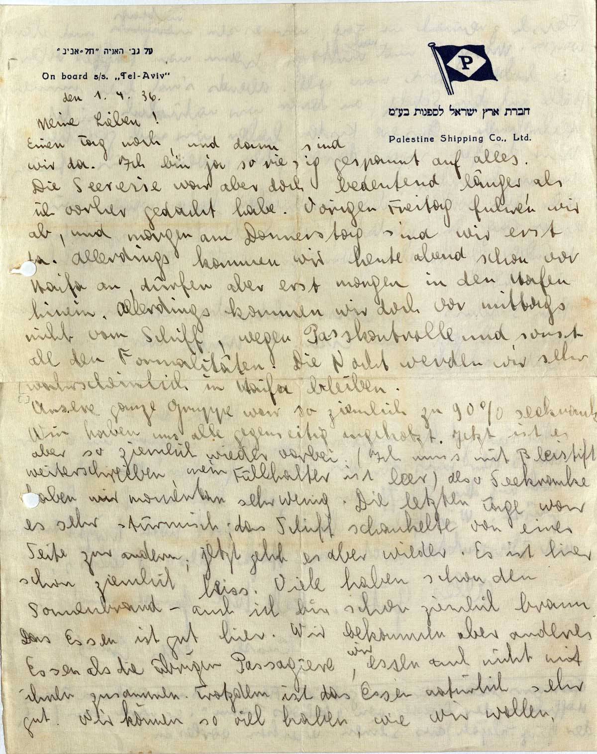 Wir sind gut hier angekommen, schon morgens um 6 Uhr. Um 5 Uhr mußten wir schon aufstehen. Ich bin noch auf dem Schiff. Miss Szold hat uns hier begrüßt. Wir fahren heute sofort nach Kirjat Anavim und übernachten nicht in Haifa. Also Schluß.